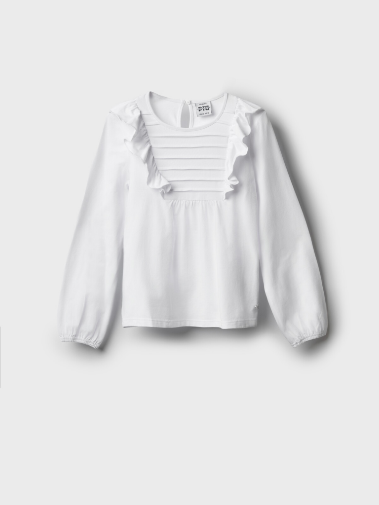 Белая нарядная блузка для школыИдеальный вариант на 1 сентября и для повседневной носки! Эта трикотажная блузка сочетает нарядный дизайн и комфорт для учебы.Ключевые особенности:+ Романтичные воланы по переду - создают праздничный образ+ Посадка comfort - не сковывает движения во время занятий+ Резинка на рукавах - обеспечивает идеальную посадкуПочему стоит выбрать:Подходит как нарядный вариант на 1 сентября, так и для повседневной носкиУдобный крой для девочки-школьницы и подростка.