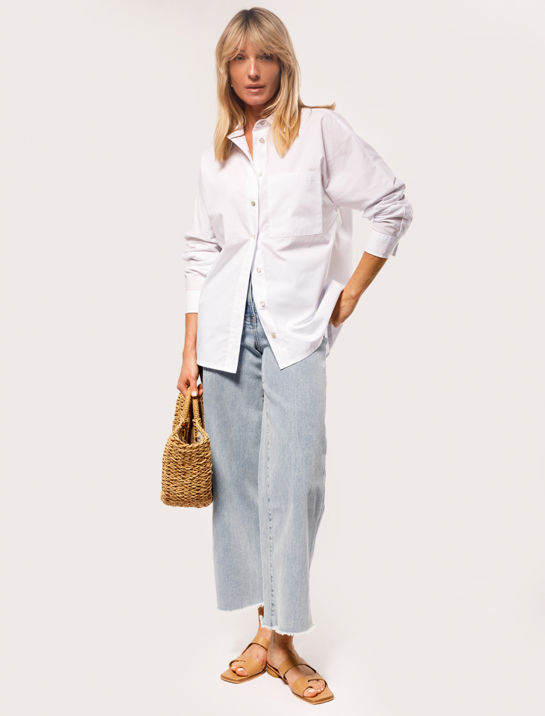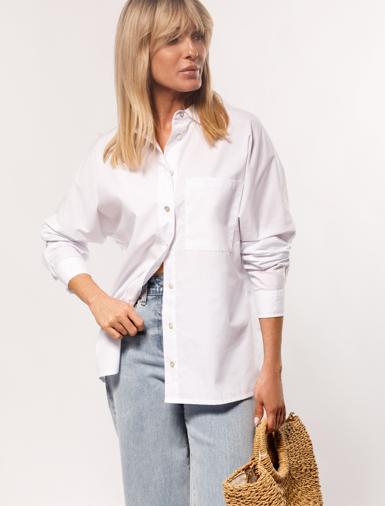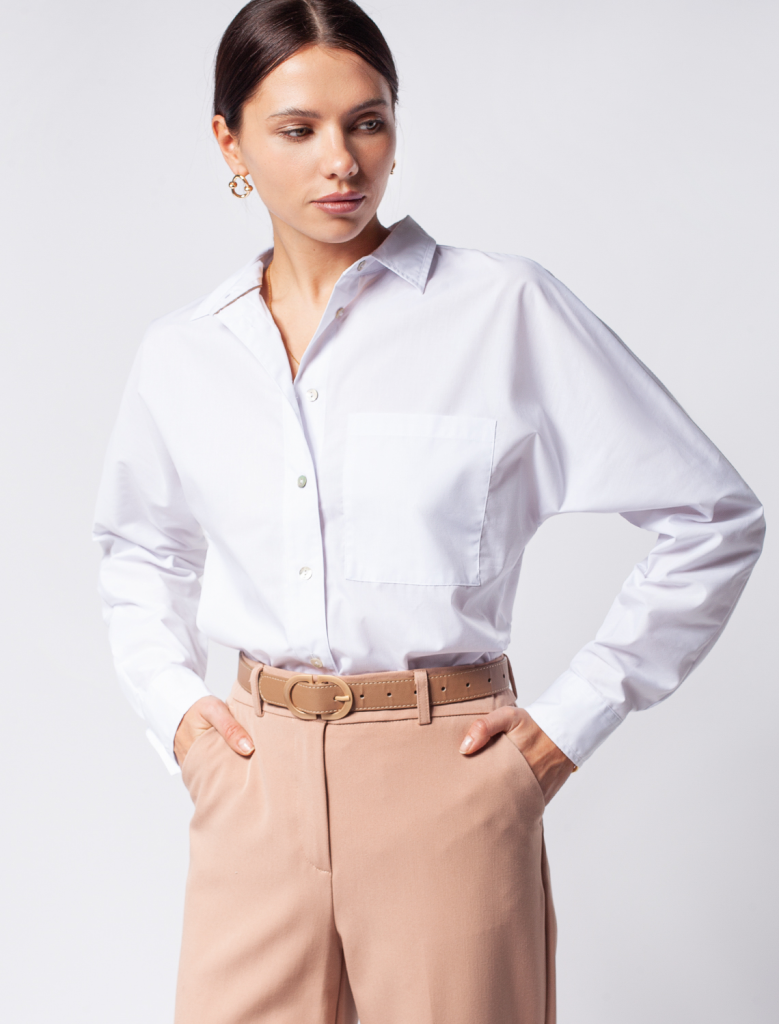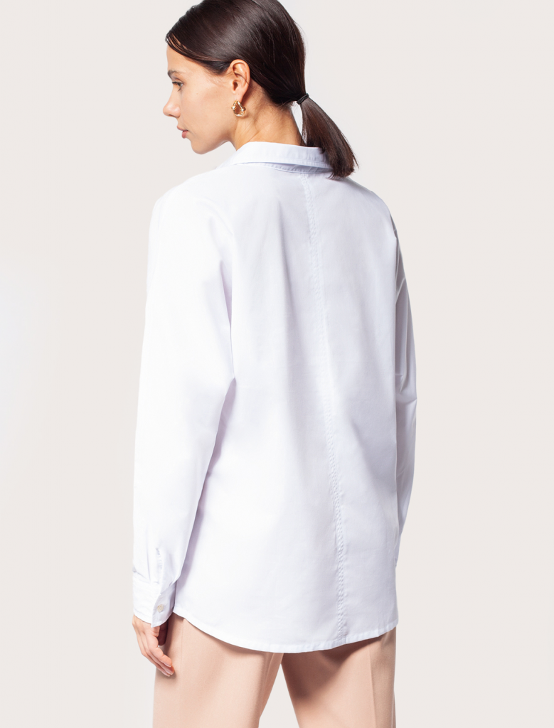 Блузка с цельнокроеным рукавом выполнена из плотного хлопка с добавлением ПЭ. Материал приятно ощущается на коже и почти не мнется, долго сохраняя идеальный внешний вид. Пуговицы из натурального перламутра. На спинке изделия металлический логотип бренда.