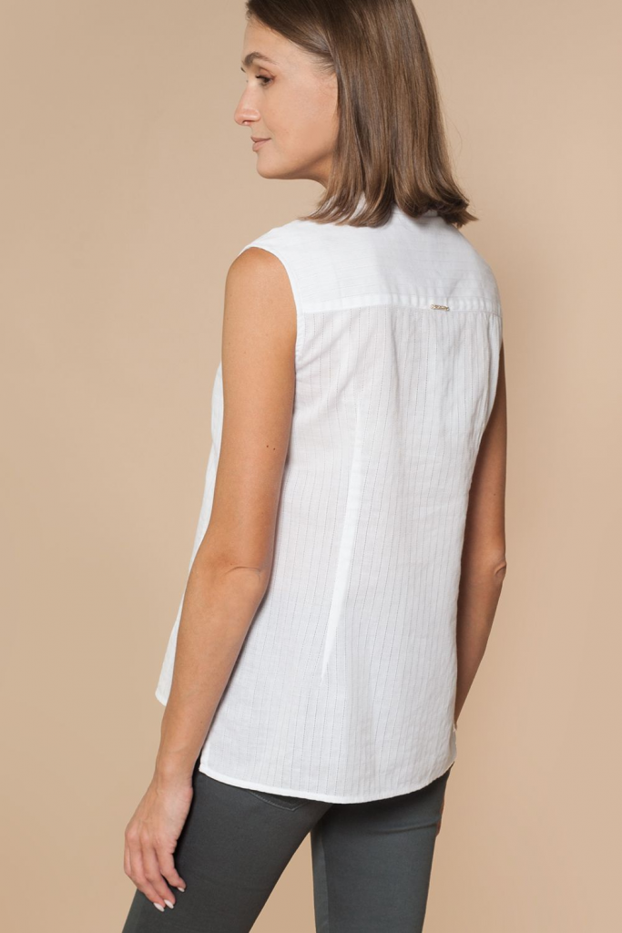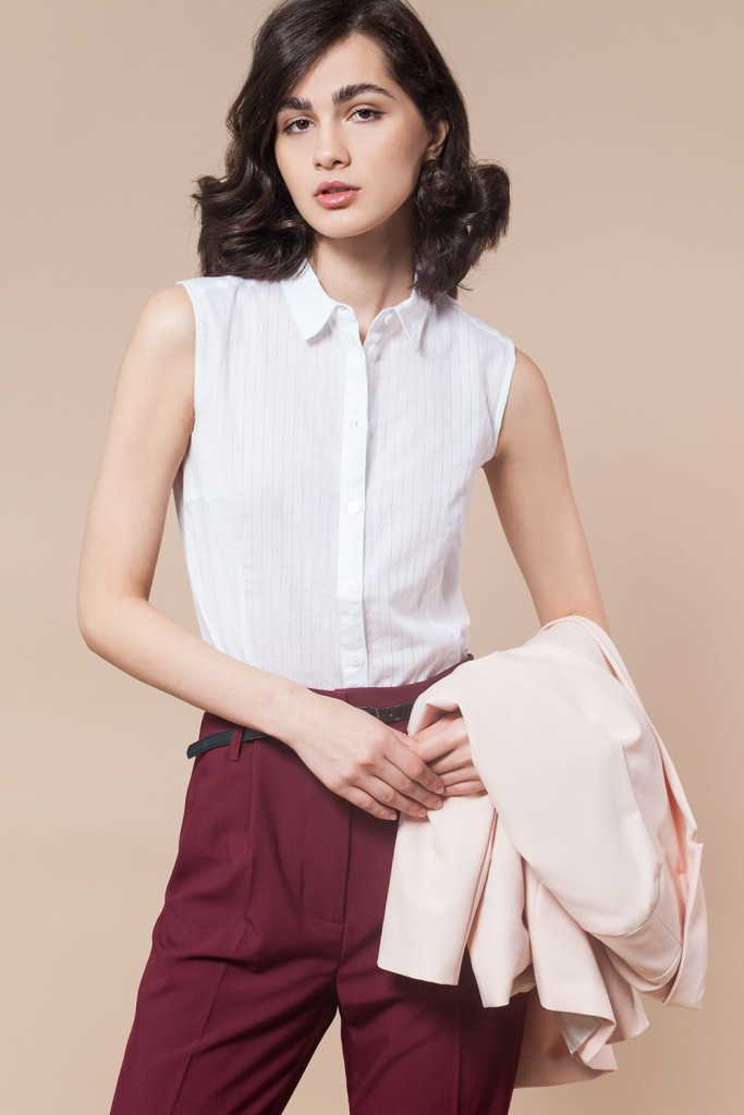 Базовая блузка из тонкого хлопка с фактурной полосой - отличное решение для летнего офиса, идеальный комфорт в комплектах с жакетами. Пуговицы под натуральный перламутр. Спинка украшена золотистым лого.
