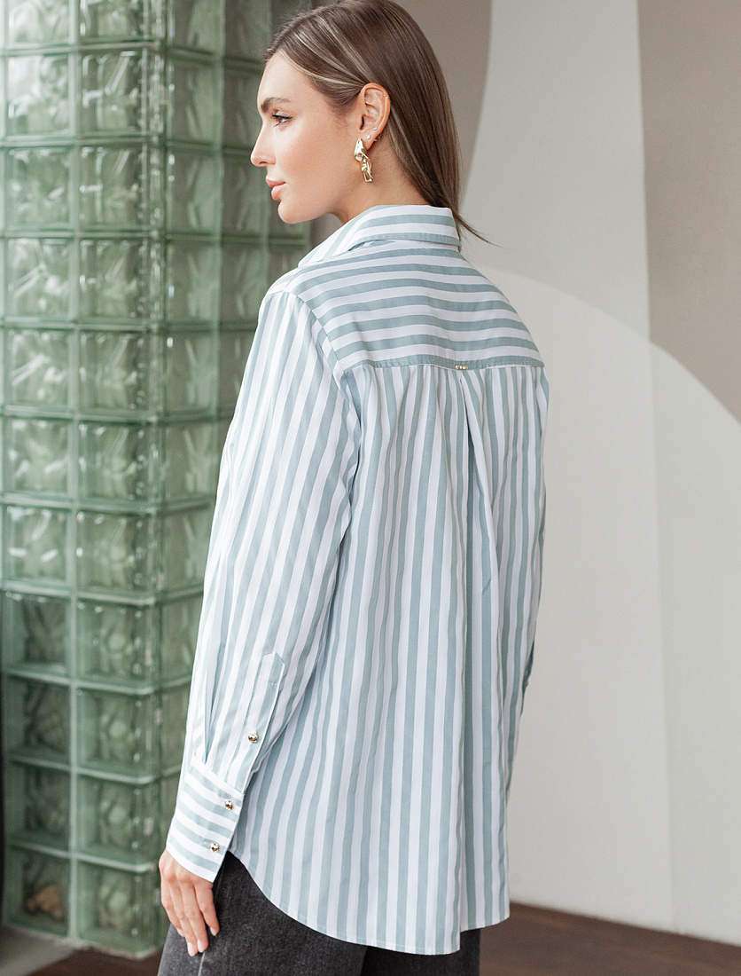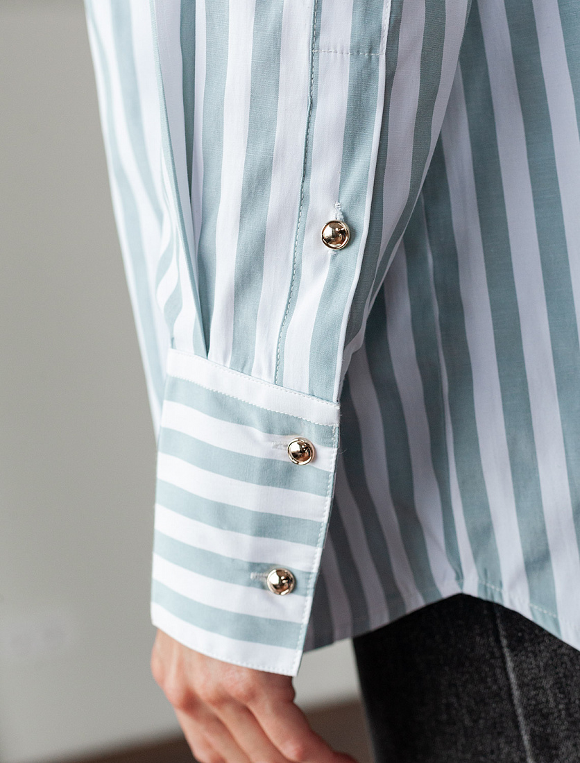 Блузка свободного силуэта выполнена из смесовой струящейся ткани. Модель в вертикальную полоску дополнена золотистыми рельефными пуговицами. Свободный силуэт подходит для любой фигуры. Для идеального роскошного образа используйте в качестве низа брюки светлых тонов. На спинке изделия фирменный металлический логотип бренда.