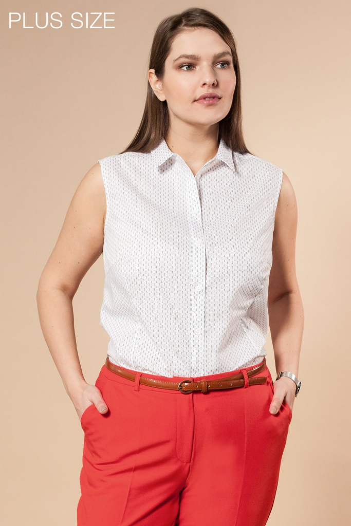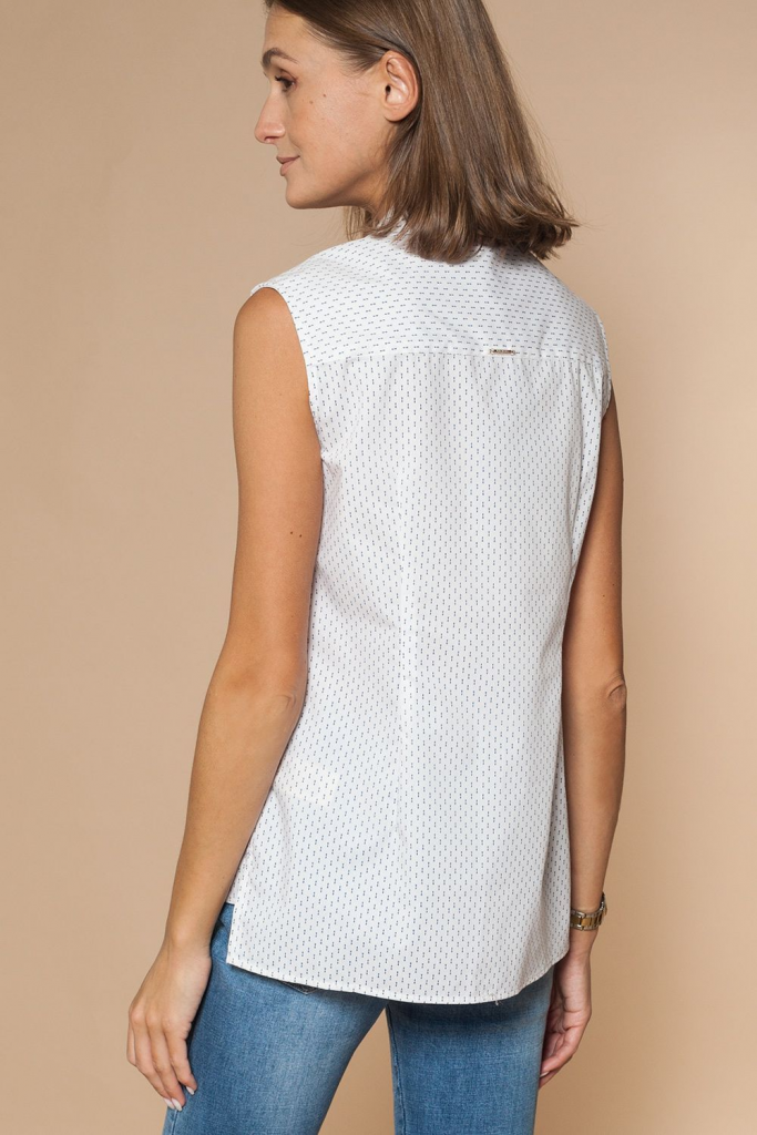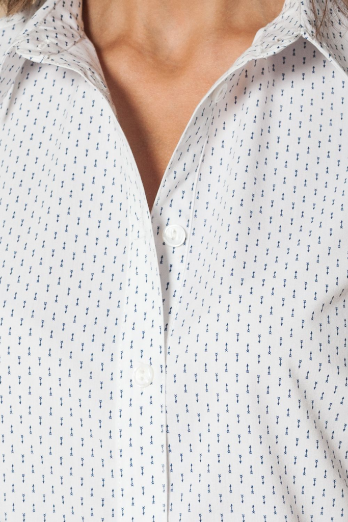 Базовая блузка из хлопка со спандексом, с аккуратным принтом - отличное решение для летнего офиса, идеальный комфорт в комплектах с жакетами. Пуговицы под натуральный перламутр. Спинка украшена золотистым лого.