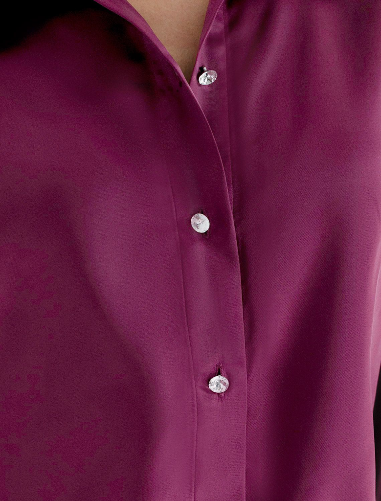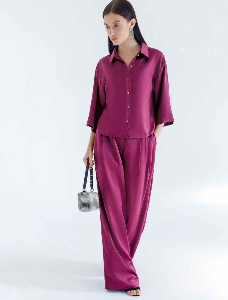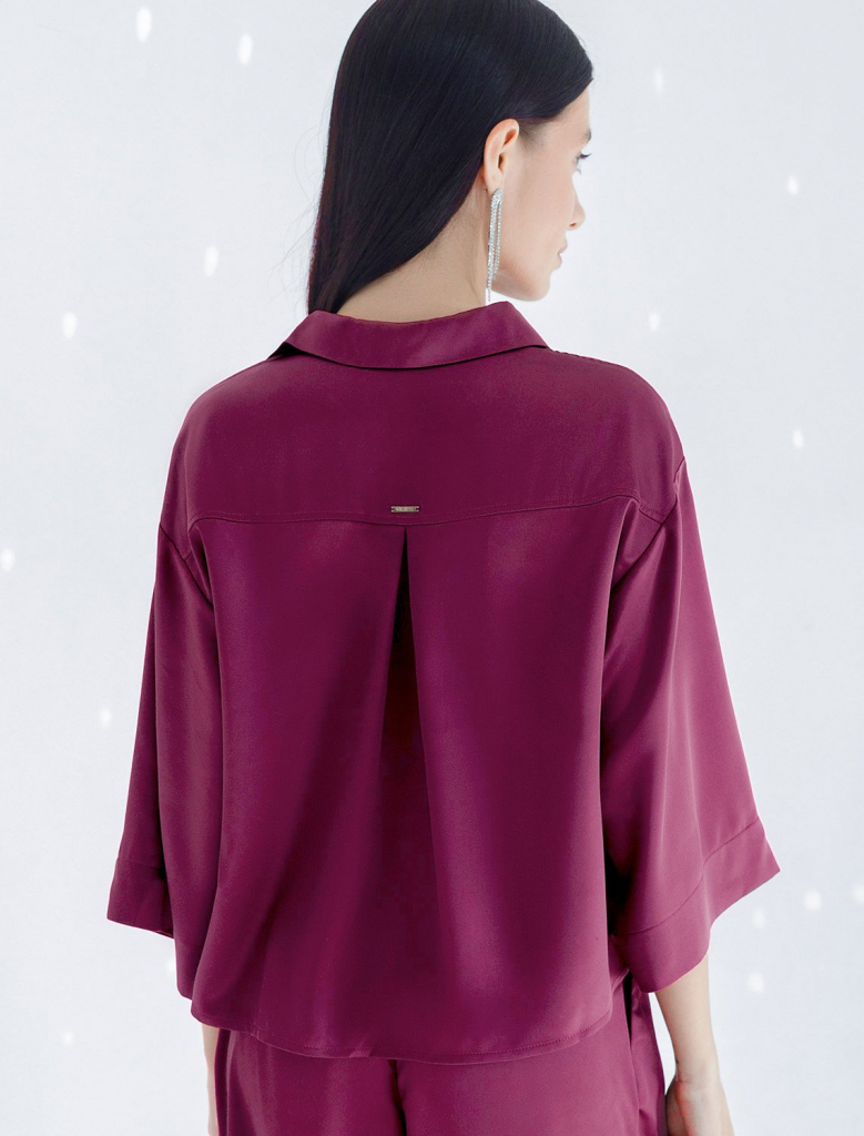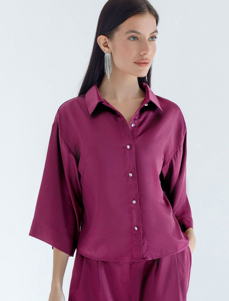 Элегантная блузка цвета бургунди на пуговицах выполнена из плотного струящегося сатина, который мягко ложится по фигуре и создает эффектную посадку. Отложной воротник придает образу женственную и изящную нотку. Материал отличается дышащей структурой, благодаря чему комфорт сохраняется даже в течение всего дня. Широкие рукава обеспечивают свободу движений и подходят для полных рук, делая блузку универсальной для разных типов фигур, в том числе для больших размеров. Красивая гладкая фактура материала подчеркивает утонченность изделия, добавляя легкое сияние к любому образу. Благодаря продуманному крою эта рубашка смотрится стильно как в повседневной жизни, так и на особых мероприятиях. Ткань практична, она приятна на ощупь, легко ухаживается и долго сохраняет первоначальный вид даже после многократных стирок и активной носки.Блузка с короткими рукавами станет отличным выбором для создания элегантного и практичного образа, блузка удобна для повседневного ношения в любое время года. Для женщин, которые ценят пра