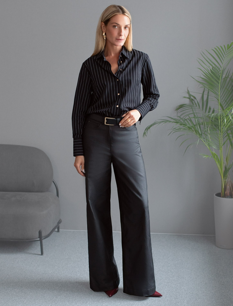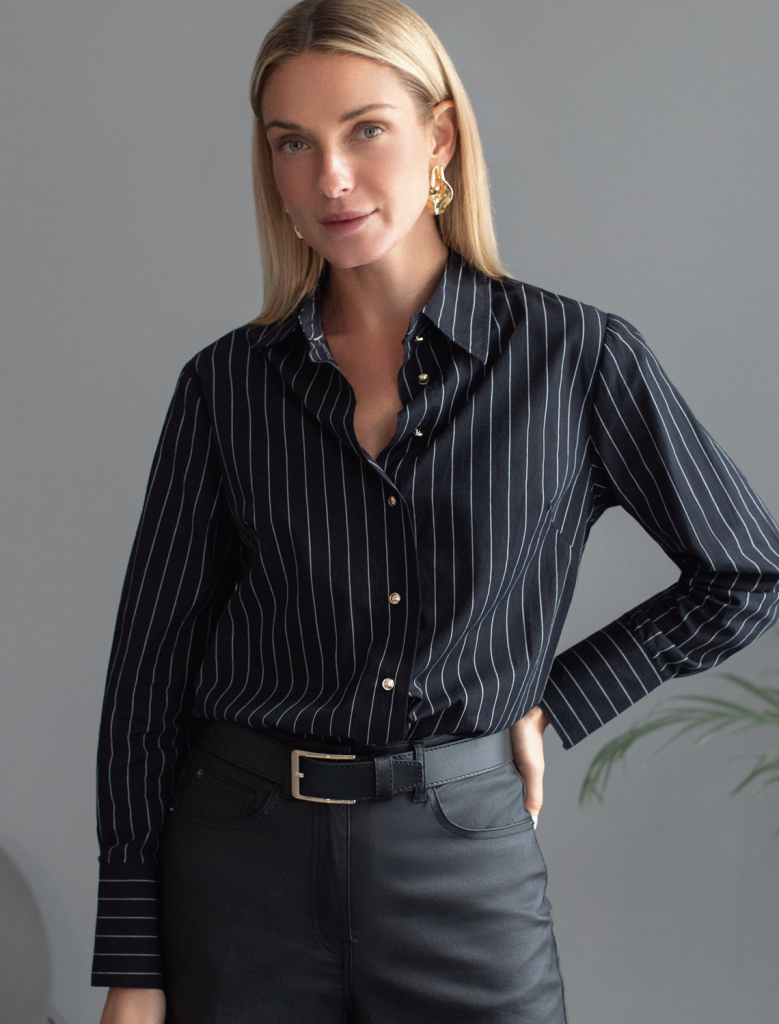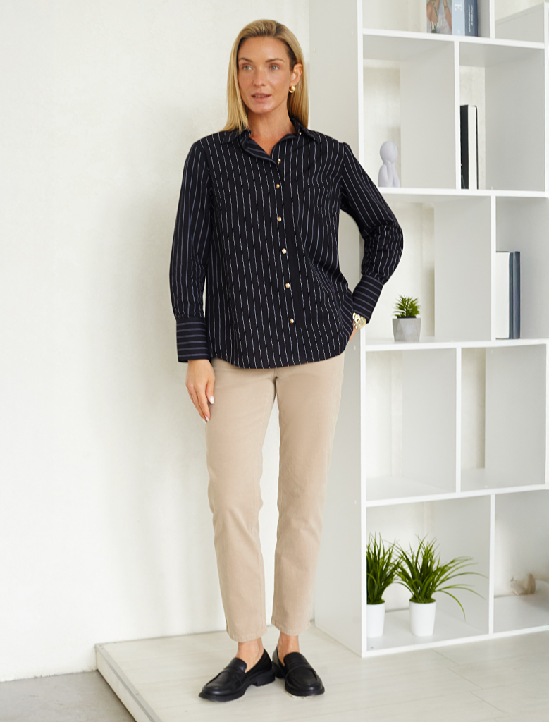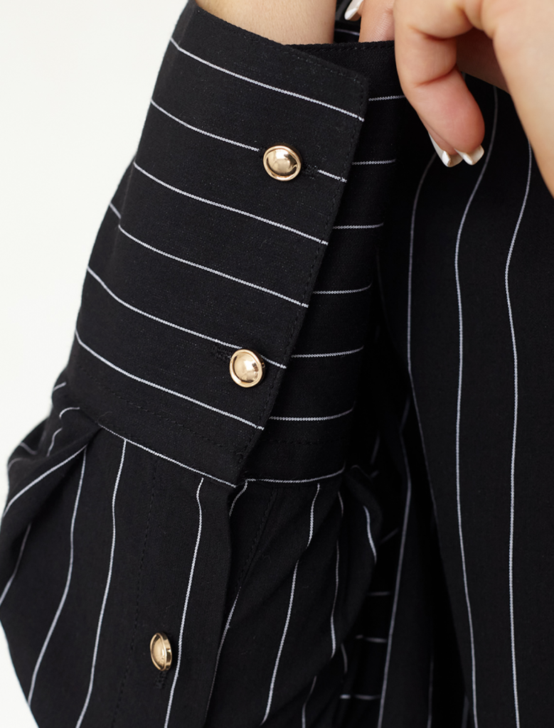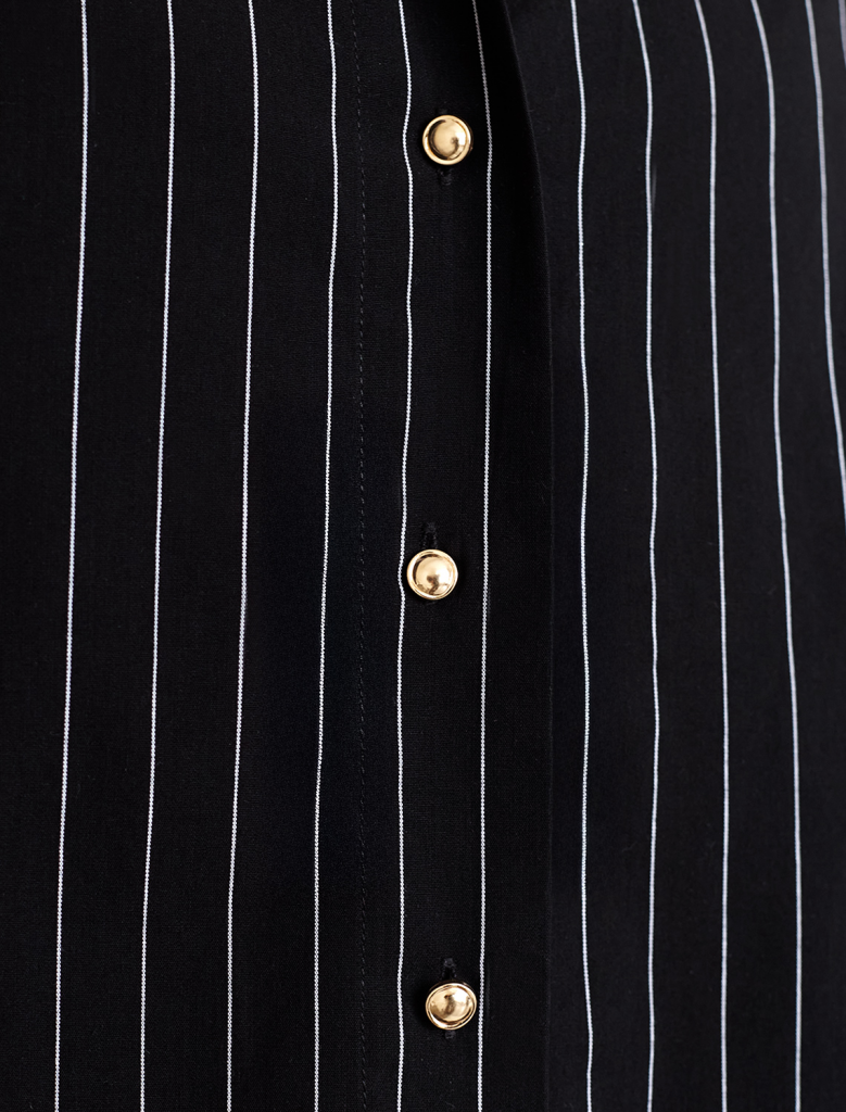 Блузка свободного силуэта выполнена из 100% хлопка. Модель черного цвета в тонкую белую полоску дополнена золотистыми рельефными пуговицами. Свободный силуэт подходит для любой фигуры. Для идеального роскошного образа используйте в качестве низа брюки светлых тонов. На спинке изделия фирменный металлический логотип бренда.
