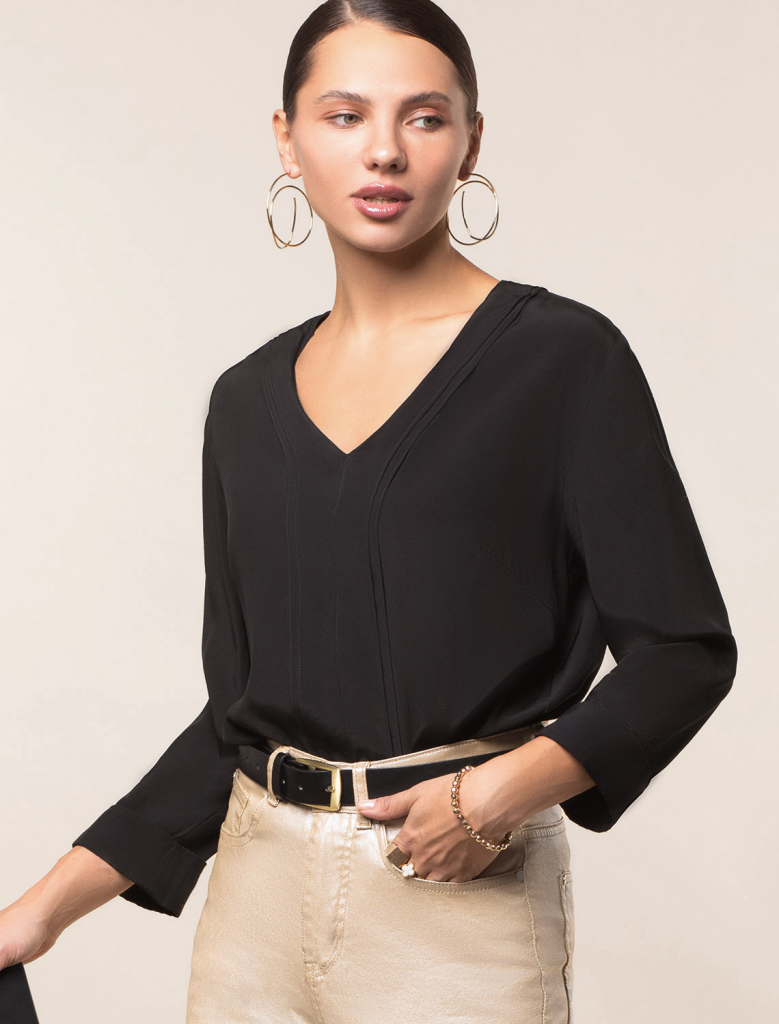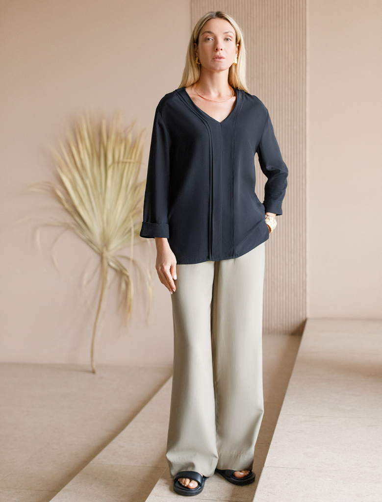 Летящая блузка выполнена из премиальной вискозы и лиоцелла. Лаконичная модель с полуматовым блеском украшена мягким воланом. Приятная на ощупь ткань охлаждает кожу в жаркую погоду. Отлично впишется в нестрогий офисный дресс-код или в расслабленном повседневном образе с джинсами и юбками.