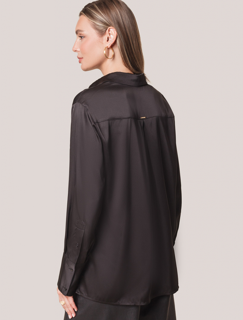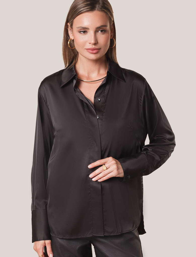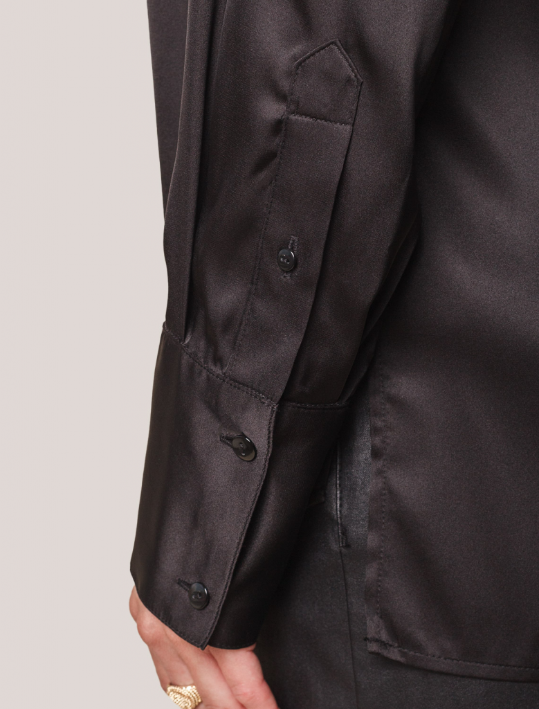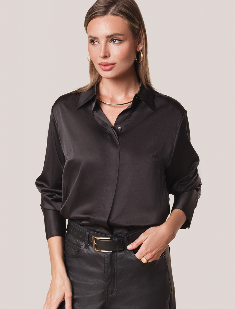 Сатиновая блузка с эластаном в черном цвете – воплощение элегантности и комфорта. Благородный блеск сатина добавляет образу шика, а эластичность материала гарантирует удобство при носке. Прямой силуэт блузки обеспечивает комфорт, а эластичность материала предотвращает деформацию. Застежка-планка с потайными пуговицами придает модели аккуратность. Универсальный вариант для casual-образов.