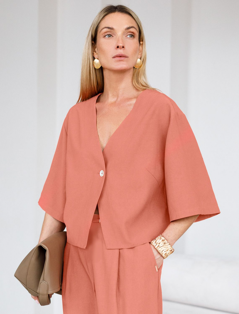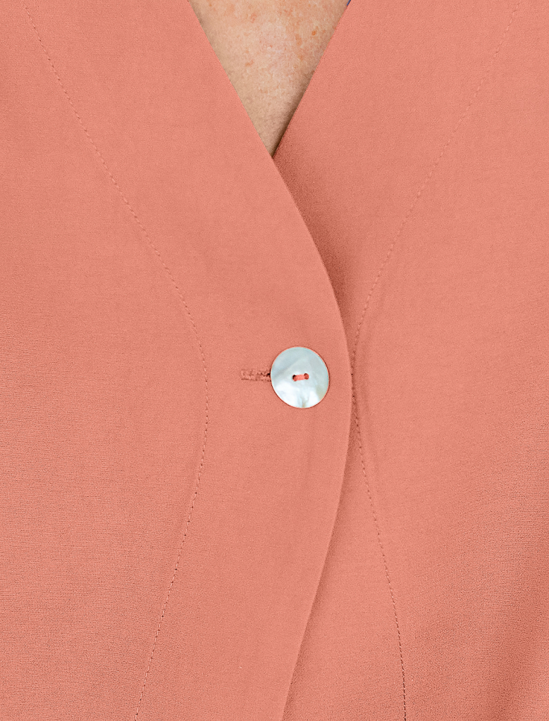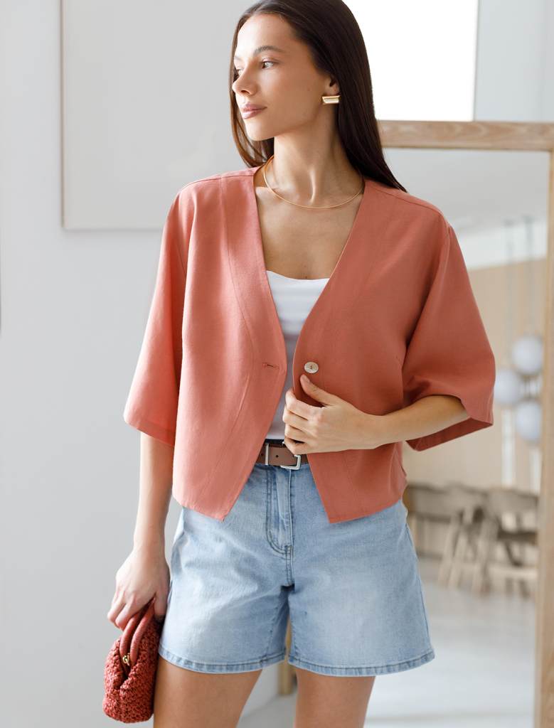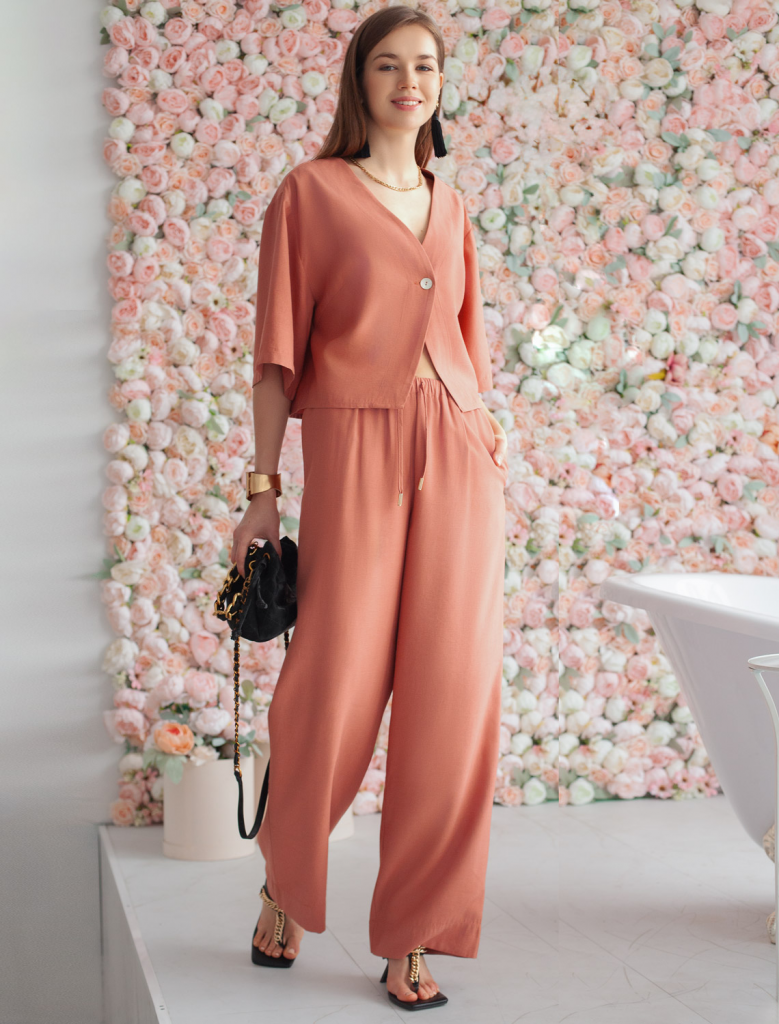 Блузка свободного кроя в стиле кимоно выполнена из плотного лиоцелла. Модель со спущенным плечом и застежкой на одну пуговицу. Ткань изделия отлично держит форму, плавно драпируется и не просвечивает. В теплое время года приятно охлаждает кожу. Добавление синтетических волокон в составе изделия, предотвращает сминаемостьи поддерживает формоустойчивость. Блузка сочетается в костюме с брюками D24.261, D24.265, D24.267, шортами D28.057 и юбкой D24.261, а также очень эффектно с белыми шортами и джинсами.