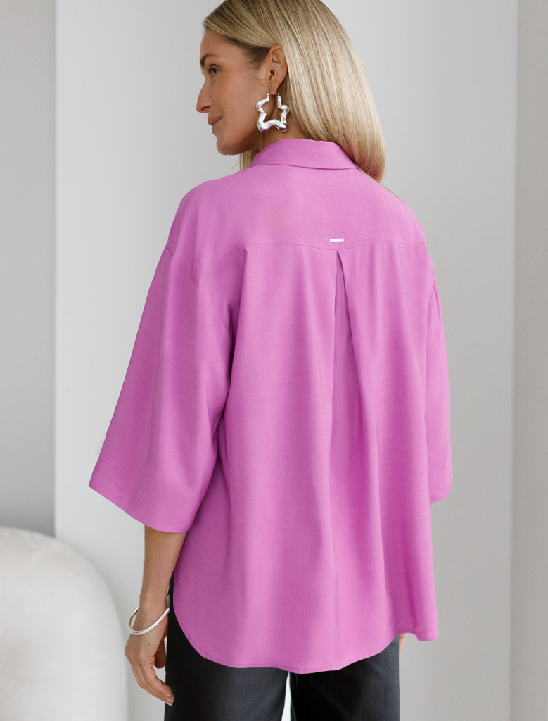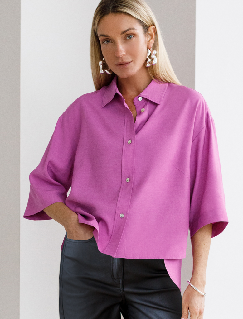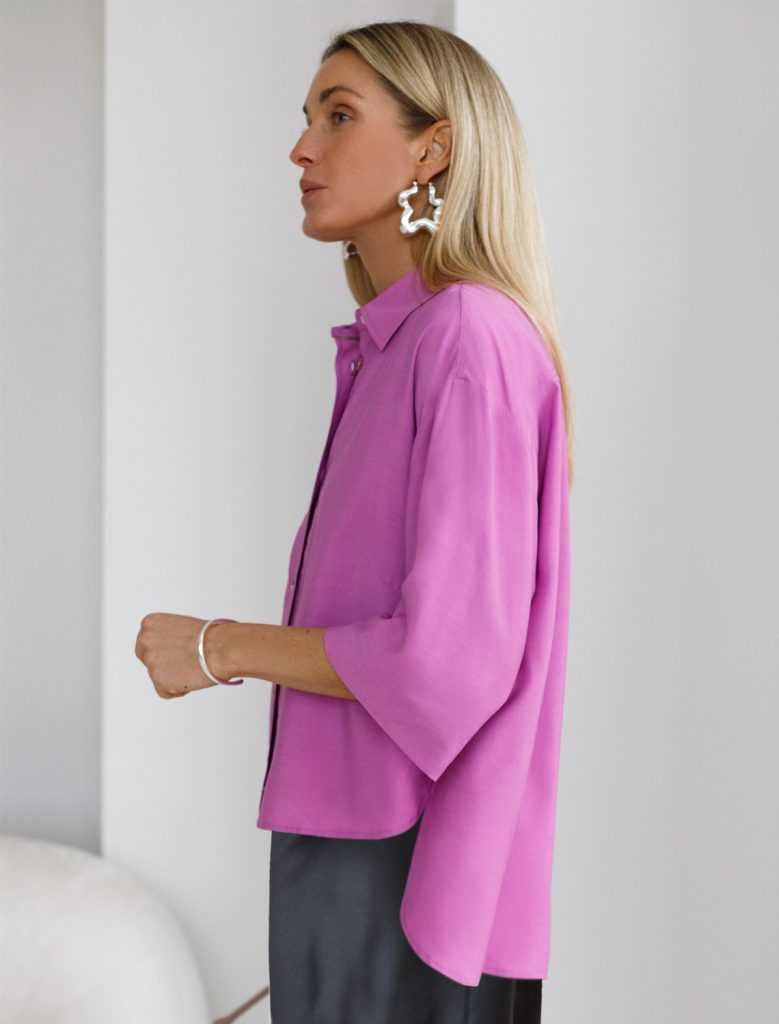Летящая блузка с отложным воротником выполнена из премиальной вискозы и лиоцелла. Мягкий фактурный материал струится по телу. Вискоза обеспечивает отличную воздухопроницаемость и поддерживает комфортный микроклимат. Модель дополнена пуговицами из натурального перламутра, на спинке изделия металлический логотип бренда. Отлично впишется в нестрогий офисный дресс-код или в расслабленном повседневном образе с джинсами и юбками.