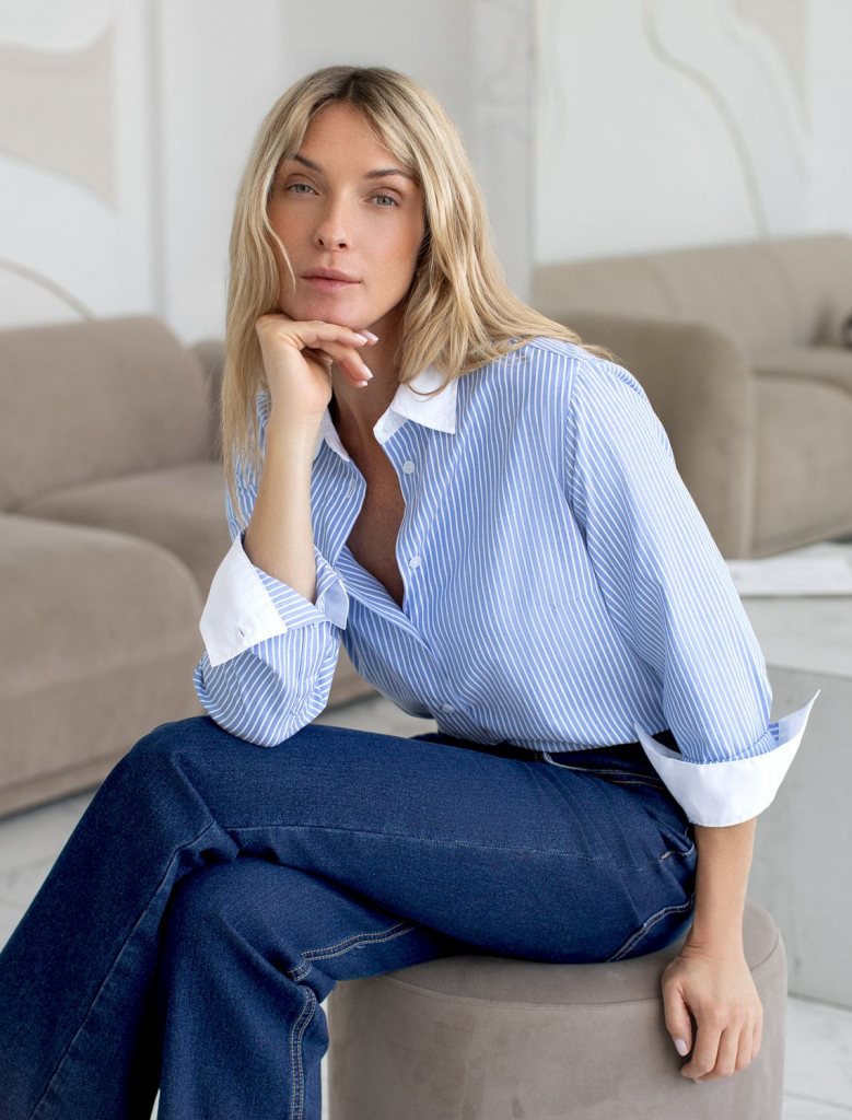 Блузка прямого силуэта с контрастными манжетами и отложным воротником. Модель выполнена из хлопка с добавлением ПЭ, благодаря этому материал почти не мнется, долго сохраняет идеальный внешний вид. На спинке изделия металлический логотип бренда.