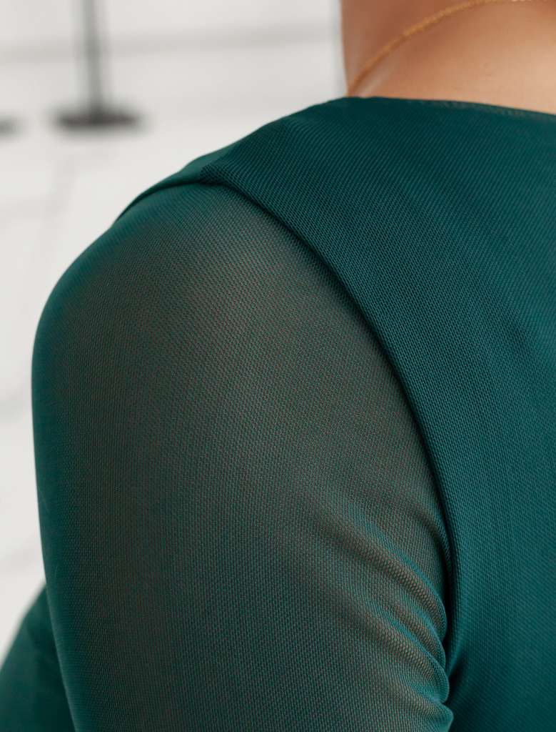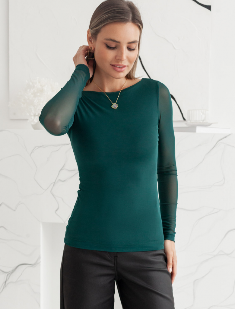 Джемпер с вырезом лодочкой и прозрачными рукавами создает женственный и элегантный образ. Тело джемпера изумрудного цвета выполнено из плотного вискозного трикотажа, обеспечивающего комфорт, в то время как рукава из тонкой сетки создают стильный контраст. Глубокий вырез лодочка подчеркивает линию плеч и создает элегантный силуэт. Идеальный выбор для стильных образов!