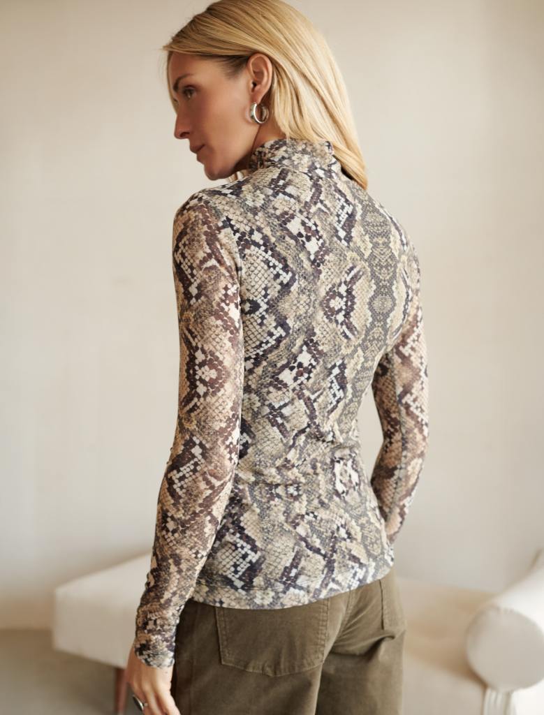 Трендовая модель - водолазка с эффектом змеиной кожи! Вискозное тело с рельефным змеиным принтом сочетается с воздушными сетчатыми рукавами, создавая эффектный контраст. Двойной воротник с отворотом повторяет экзотический узор, позволяя варьировать образ от сдержанного до дерзкого. Практичная вискоза с модным принтом – идеальное решение для тех, кто ценит стиль и комфорт. Змеиный узор делает эту модель особенно актуальной, превращая базовый предмет гардероба в модный акцент!