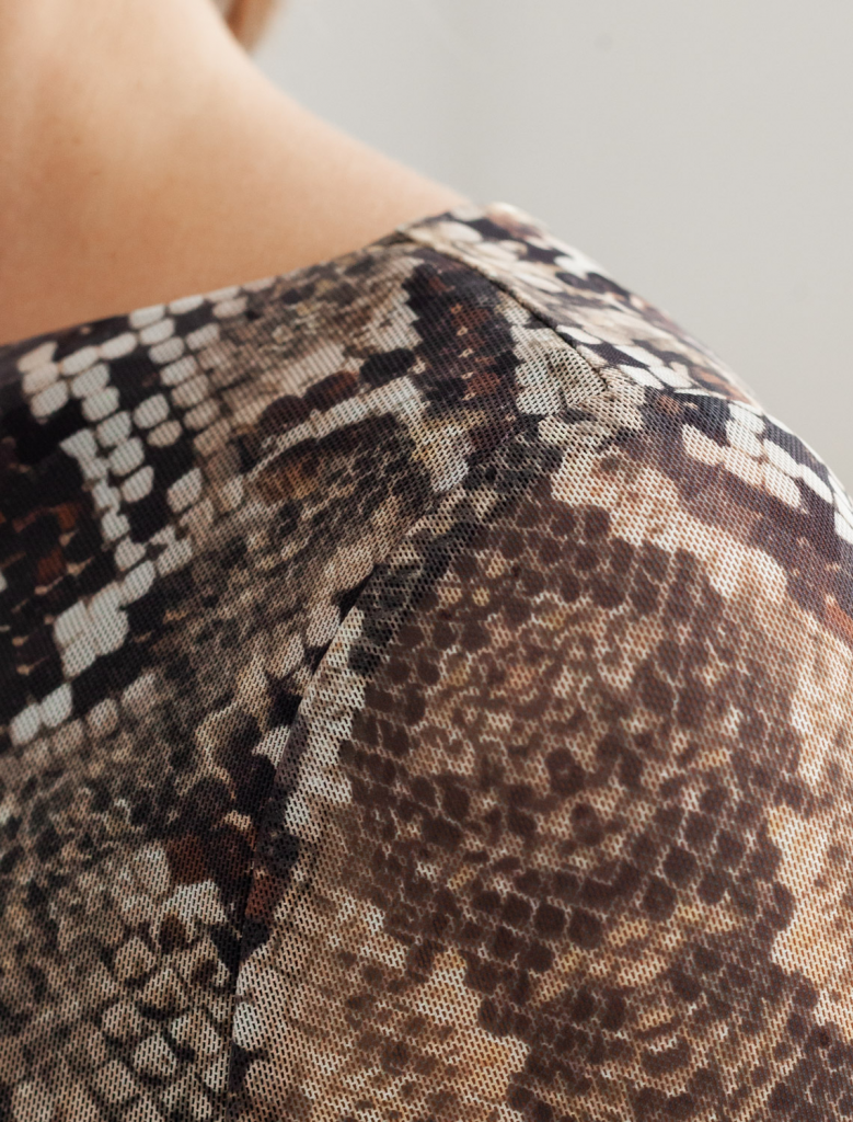 Дерзкий тренд этого сезона! Модель сочетает роскошный змеиный принт с соблазнительными полупрозрачными рукавами из тонкой сетки. Глубокий вырез-лодочка подчеркивает линию плеч, создавая элегантный и одновременно смелый образ. Идеальный выбор для стильных образов!