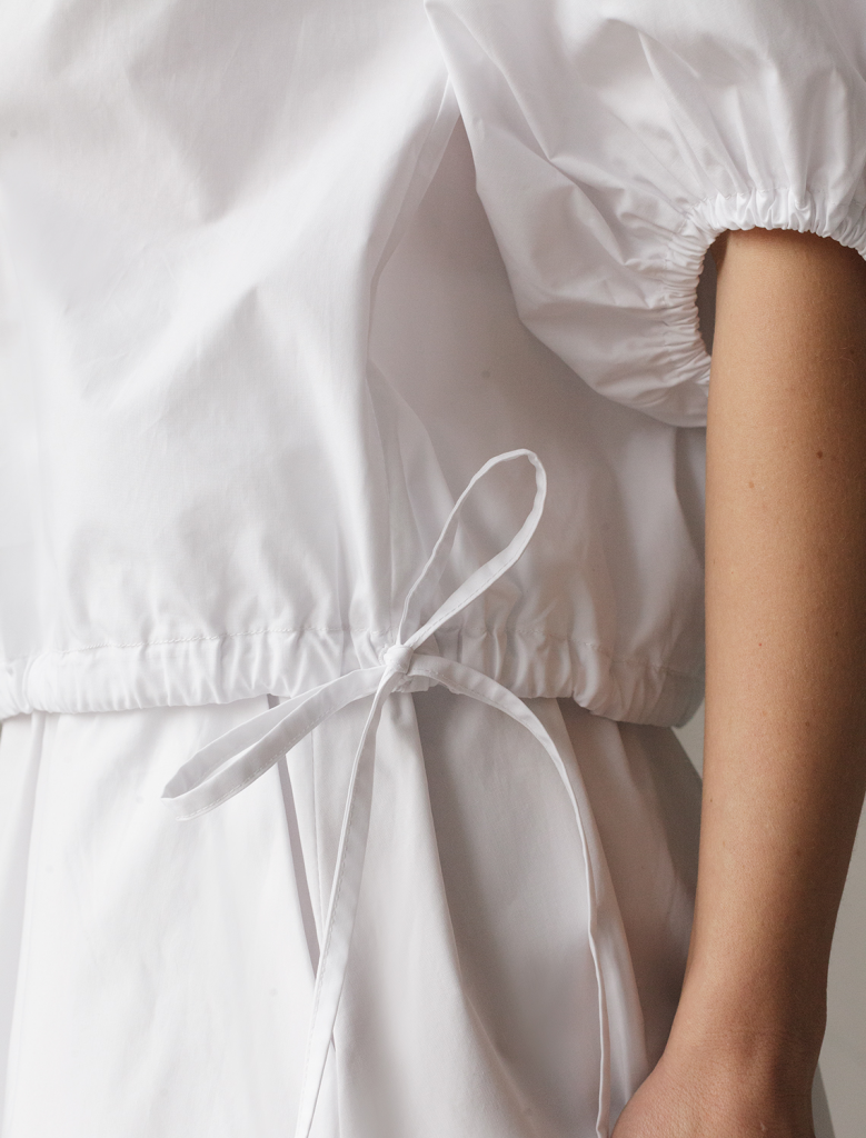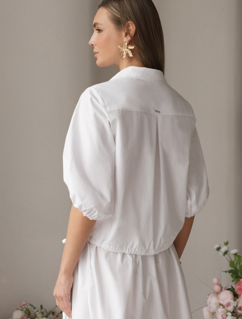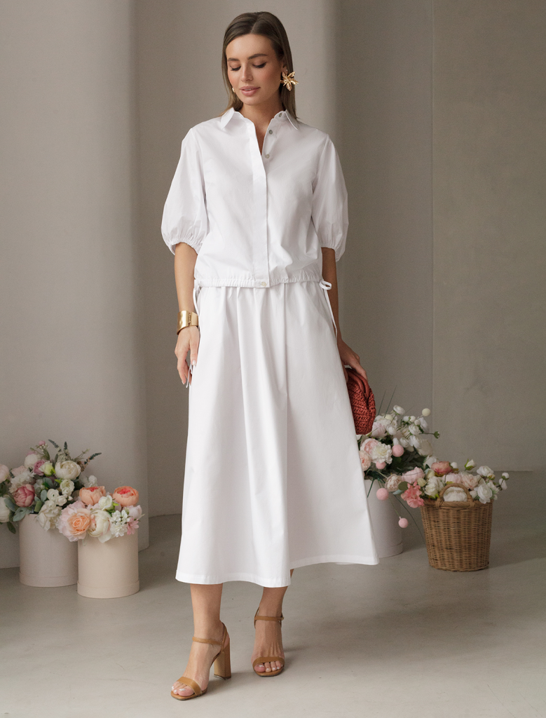 Укороченная блузка с пышными рукавами-фонариками выполнена из легкого хлопкового поплина. Супатная застежка на пуговицы из натурального перламутра. Внизу кулиса с лентами из основного полотна. В изделии будет комфортно, даже в самое жаркое время года. Подходит для любой фигуры. Сочетается в костюме с кюлотами D24.233 и юбкой D26.179