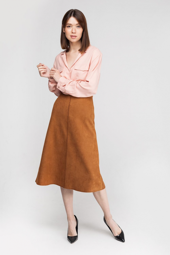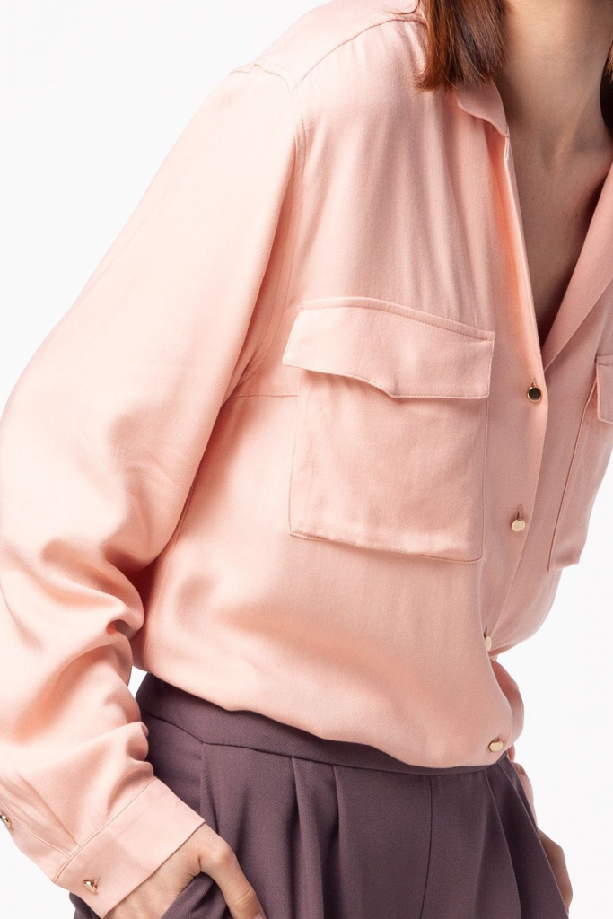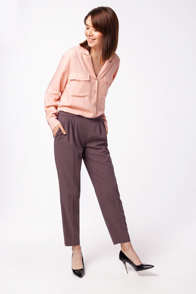 Блузка прямого силуэта. Выполнена из мягкой вискозы в рубчик. Плетение придает ткани плотности и легкого благородного блеска. Воротник с небольшим лацканом - тренд сезона. Карманы накладные с клапанами.