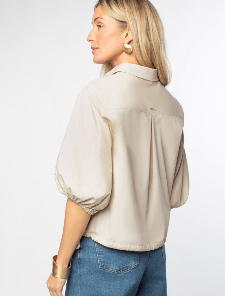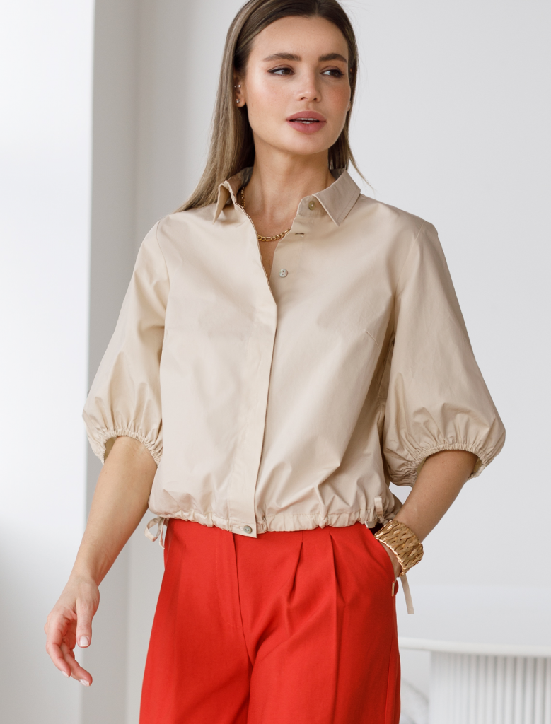 Укороченная блузка с пышными рукавами-фонариками выполнена из легкого хлопкового поплина. Супатная застежка на пуговицы из натурального перламутра. Внизу кулиса с лентами из основного полотна. В изделии будет комфортно, даже в самое жаркое время года. Подходит для любой фигуры. Сочетается в костюме с кюлотами D24.233 и юбкой D26.179