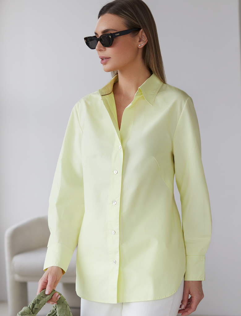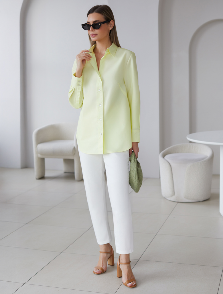 Блузка выполнена из легкого хлопкового поплина. Лаконичная модель с высокими манжетами и пуговицами из натурального перламутра хорошо впишется в любой гардероб и внесет яркий летний акцент в образ. Натуральный состав ткани обладает высокой воздухопроницаемостью и гигроскопичностью. В изделии будет комфортно, даже в самое жаркое время года. Подходит для любой фигуры. На спинке фирменный логотип бренда.