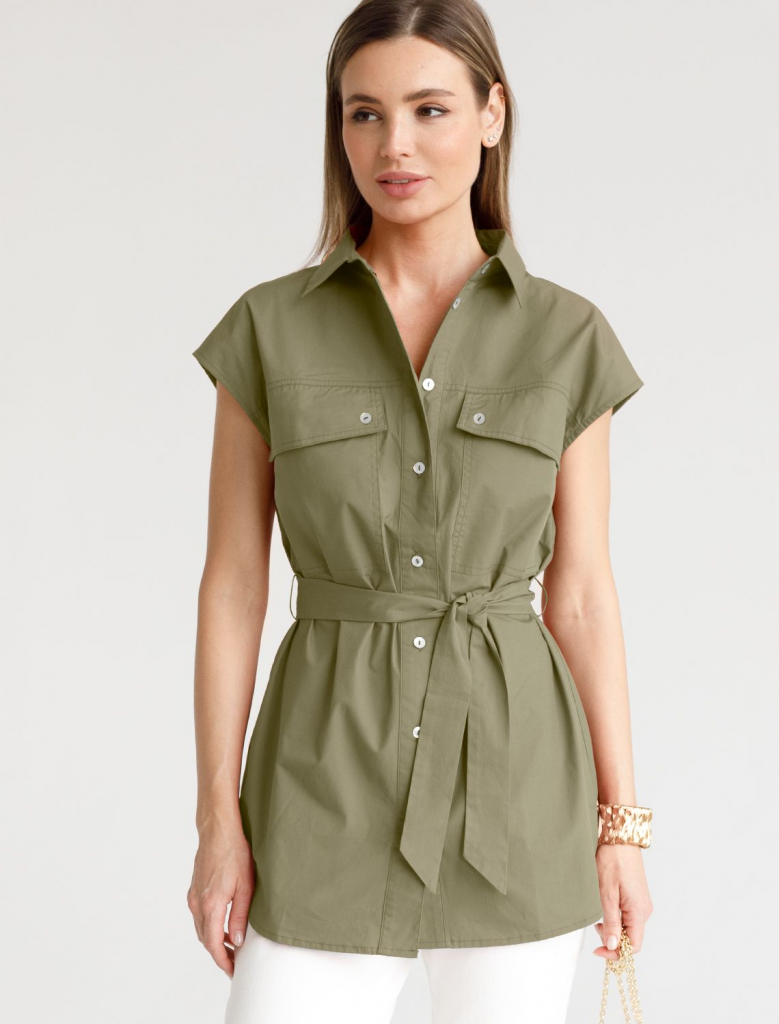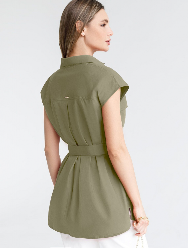 Удлиненная блузка в стиле сафари из легкого хлопкового поплина. Модель со спущенной линией плеча дополнена двумя накладными карманами. В комплекте идет пояс из основного полотна. В изделии будет комфортно, даже в самое жаркое время года. Подходит для любой фигуры. Сочетается в костюме с кюлотами D24.233 и юбкой D26.179
