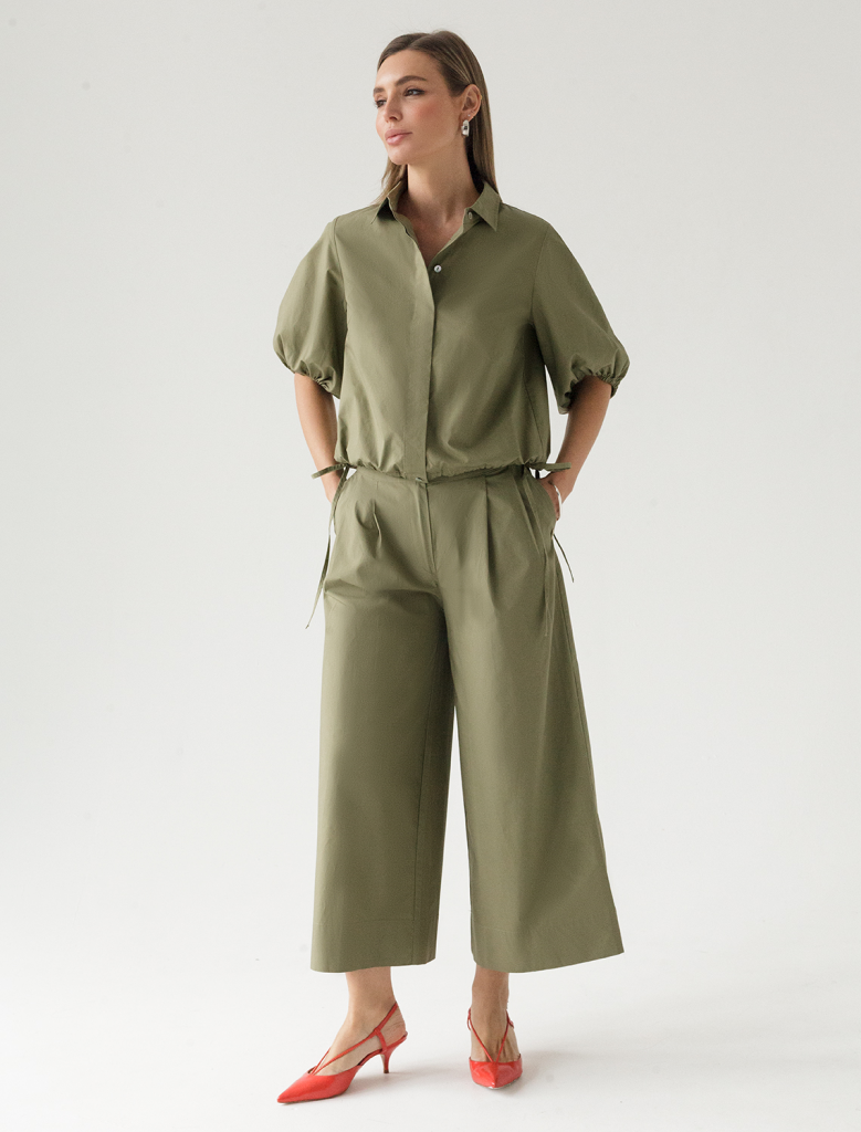 Укороченная блузка с пышными рукавами-фонариками выполнена из легкого хлопкового поплина. Супатная застежка на пуговицы из натурального перламутра. Внизу кулиса с лентами из основного полотна. В изделии будет комфортно, даже в самое жаркое время года. Подходит для любой фигуры. Сочетается в костюме с кюлотами D24.233 и юбкой D26.179