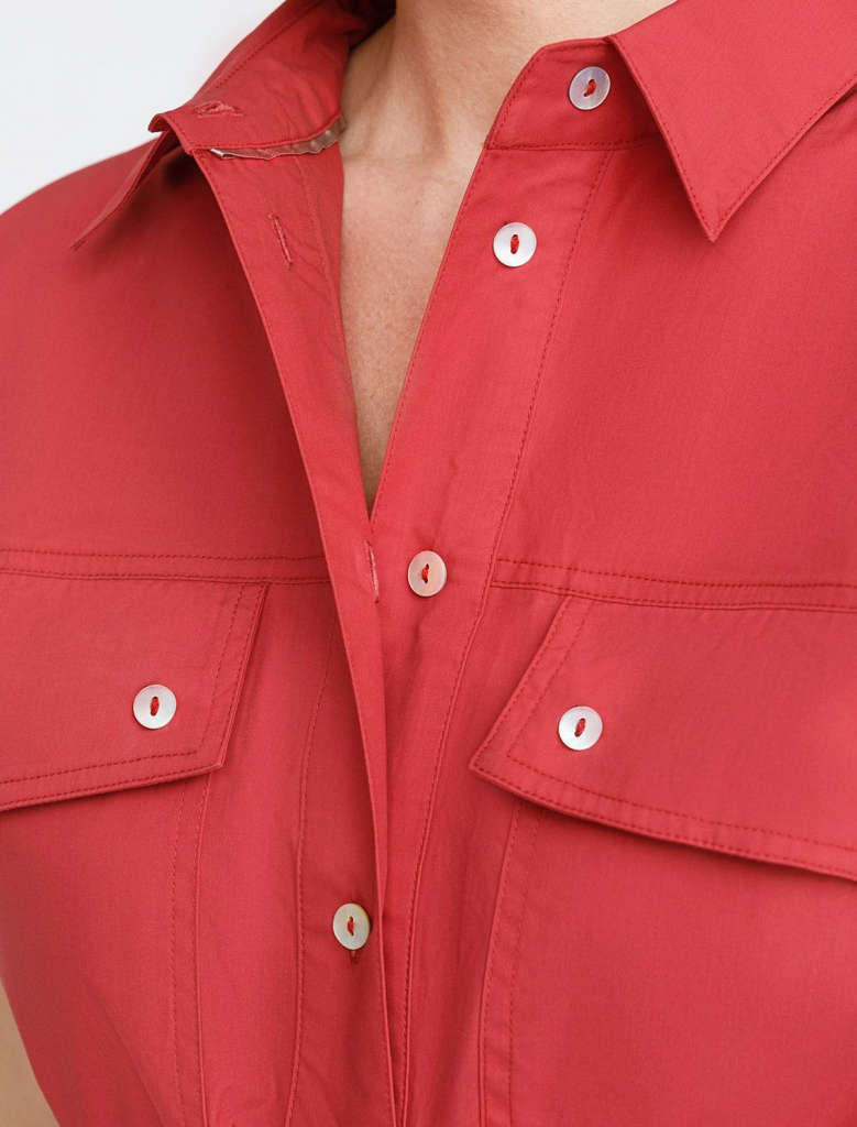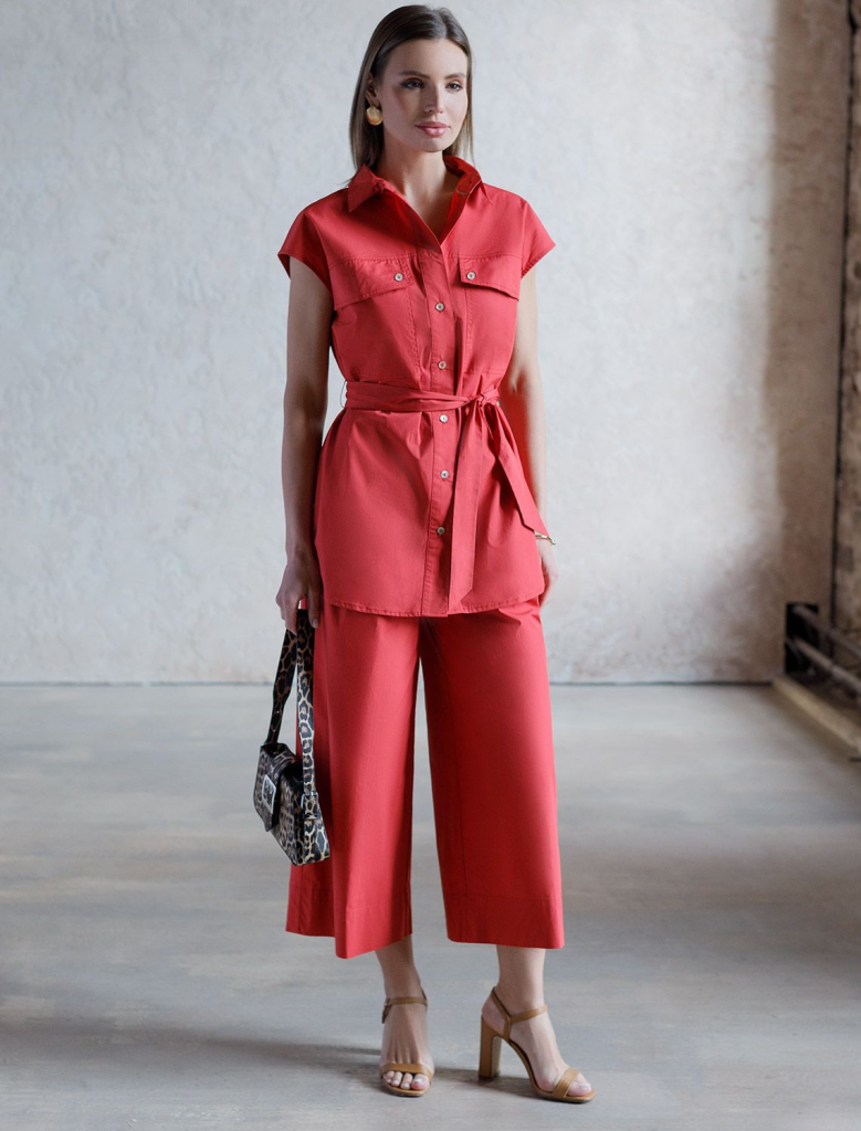 Удлиненная блузка в стиле сафари из легкого хлопкового поплина. Модель со спущенной линией плеча дополнена двумя накладными карманами. В комплекте идет пояс из основного полотна. В изделии будет комфортно, даже в самое жаркое время года. Подходит для любой фигуры. Сочетается в костюме с кюлотами D24.233 и юбкой D26.179