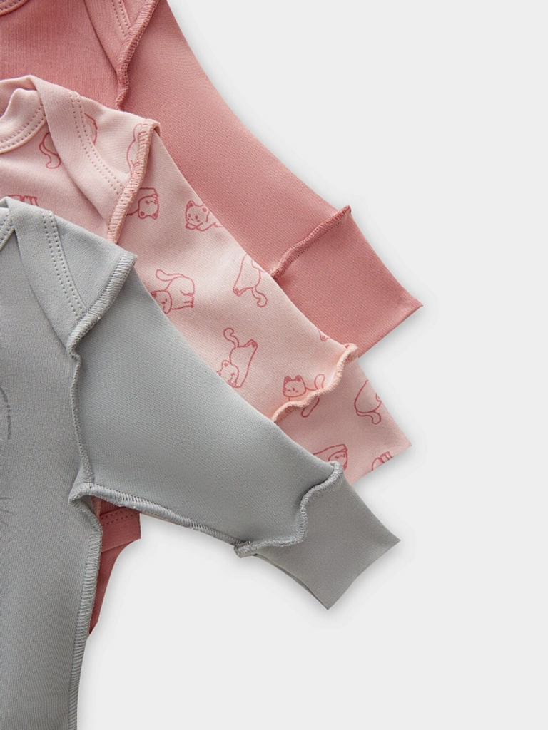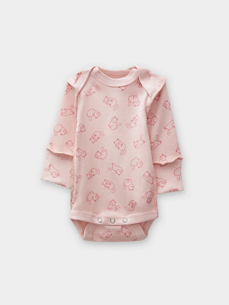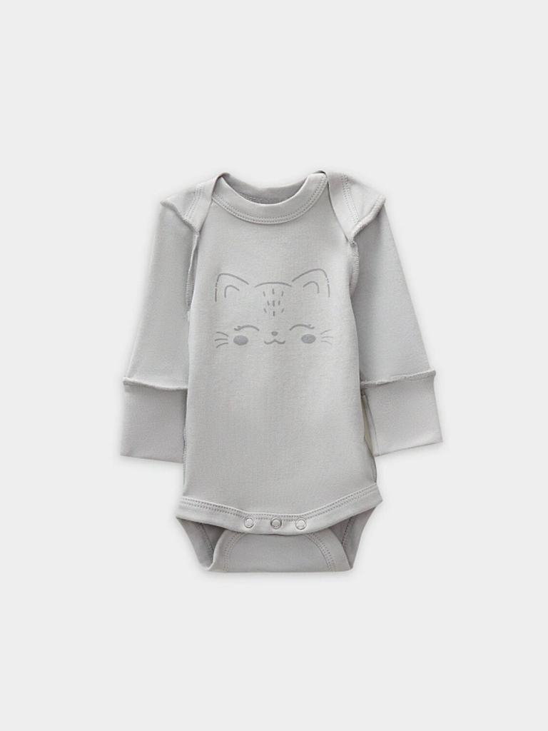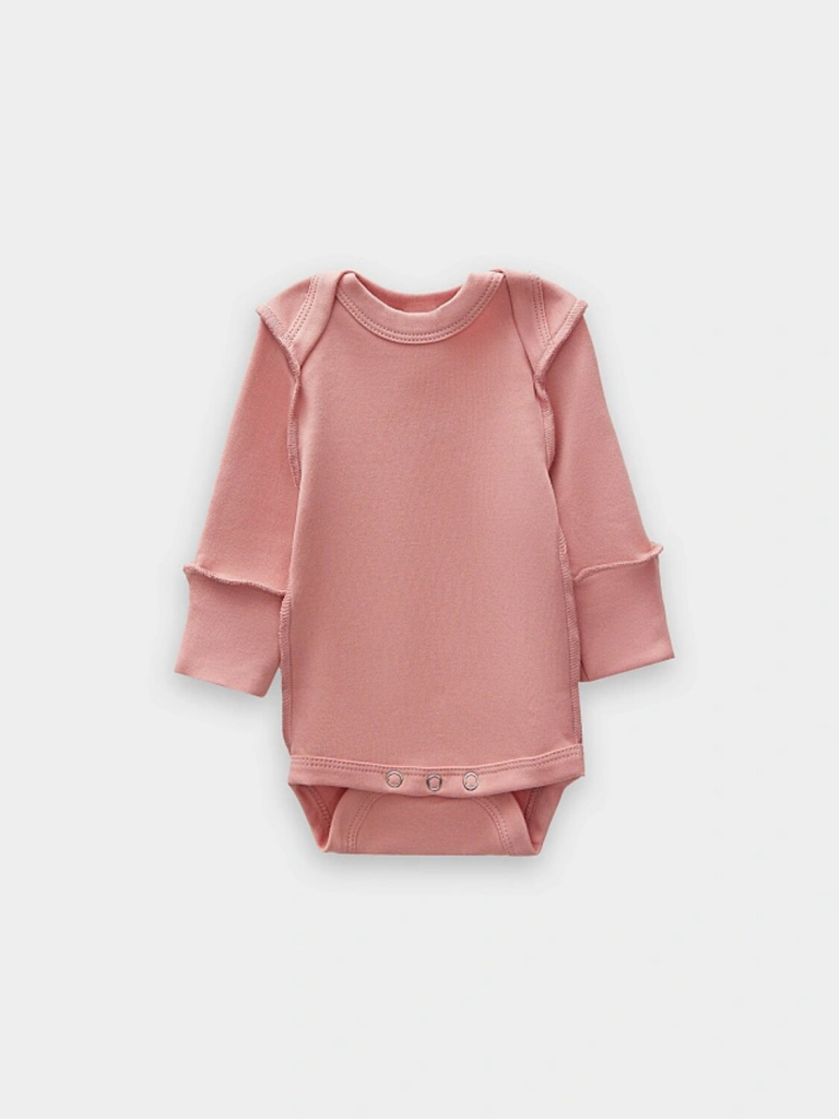 Круглая горловина с аккуратной окантовкой продумана для легкого одевания, а деликатные внешние швы добавляют современный дизайнерский штрих, оставаясь при этом мягкими и безопасными. Длинные рукава оснащены защитными царапками - практичное решение для малышей. Удобная застежка на кнопках по всей длине значительно упрощает процесс переодевания.