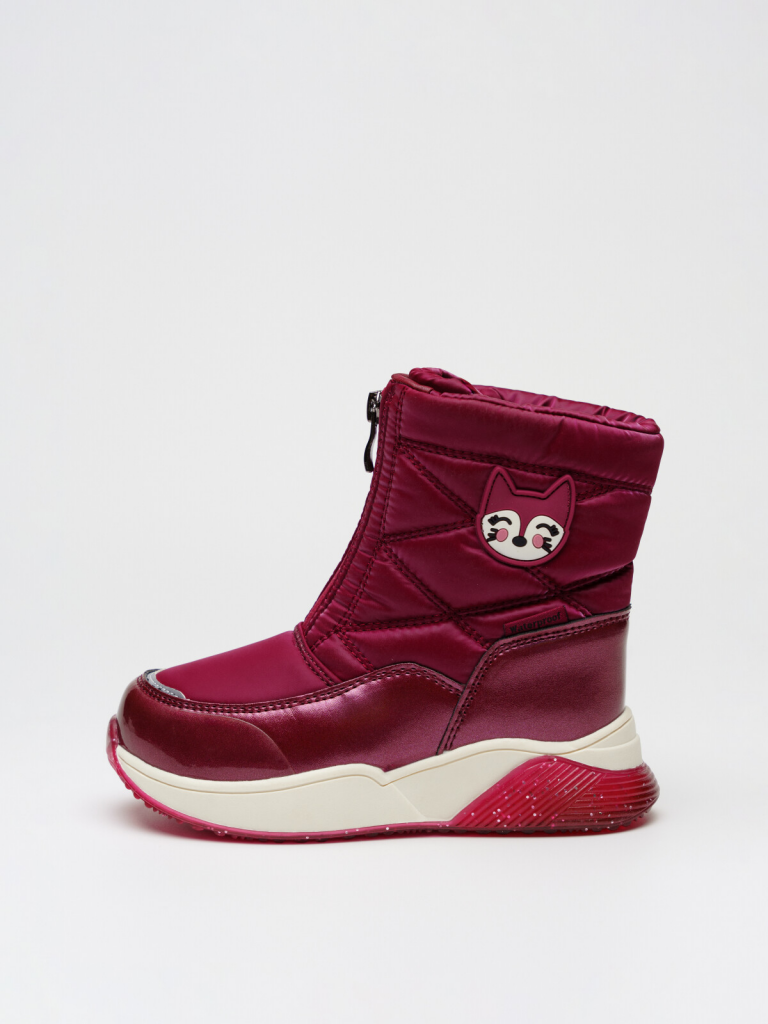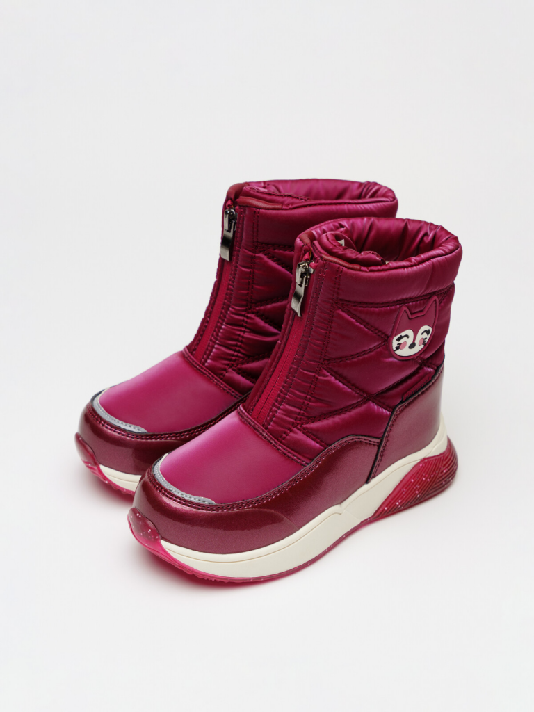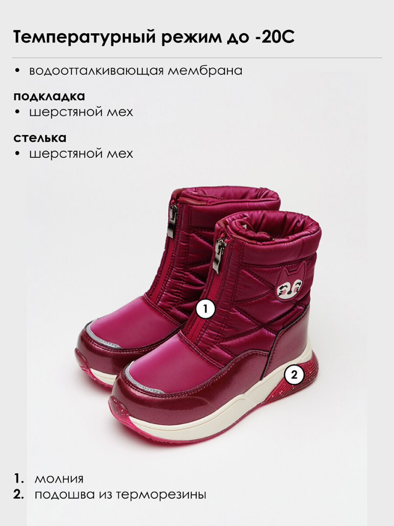 Ботинки детские зимние с мембраной для девочки. Конструкция верха изготовлена с использованием мембранных технологий. Верх обуви имеет водоотталкивающее покрытие. Модель имеет светоотражающие элементы. Подкладка и стелька выполнены из шерстяного меха 80%. Съемная стелька. Формоустойчивый задник поддерживает стопу в правильном положении. Подошва из терморезины обладает хорошими противоскользящими свойствами. Для удобства обувания модель имеет молнию спереди с защитным клапаном от проникновения влаги. Рекомендованный температурный режим ( зависит от активности ребенка и поддевы под обувь) ( зависит от активности ребенка и поддевы под обувь) от 0°С до -20°С.