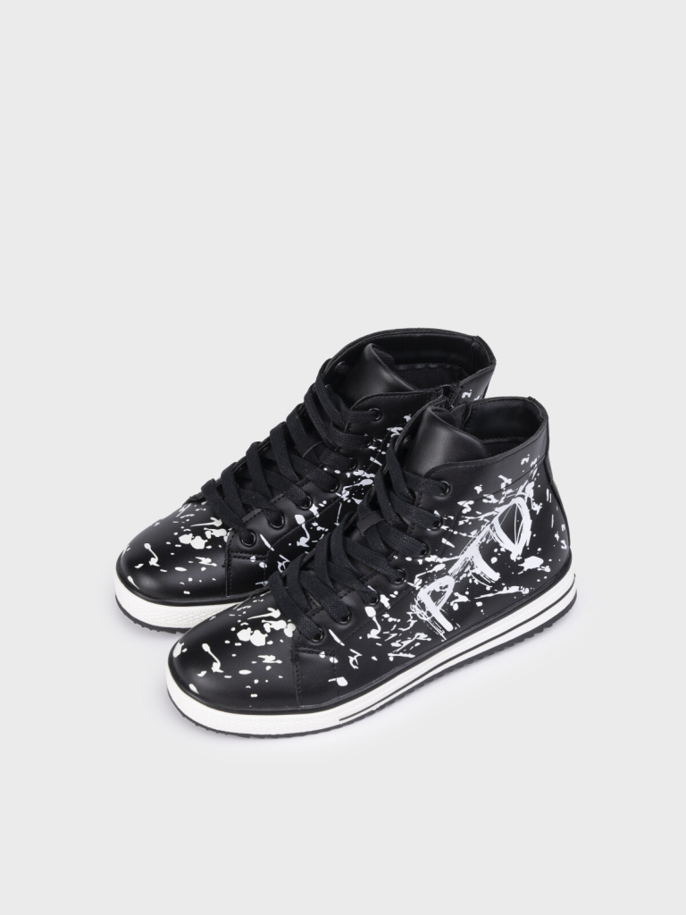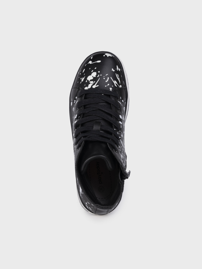 Кеды для девочки подростка. Высокие кеды из искусственной кожи с эффектом забрызгивания краской. Модель имеет шнурки, с помощью которых регулируется подъем, и изнутри молнию для удобства обувания. В носочной части обуви стоит текстильная подкладка c высоким содержанием хлопка 80%, которая обладает высокой гигроскопичностью. В пяточной части обуви текстильная подкладка обладает хорошей износостойкостью. Профилированная стелька из свиной кожи с анатомической формой подсводника обеспечивает правильную нагрузку на стопу. Двухсоставная подошва из ТПР очень гибкая, не скользит,устойчива к истиранию. Формоустойчивый задник поддерживает стопу в правильном положении. Эргономичная форма колодки обеспечивает правильное формирование стопы ребенка.