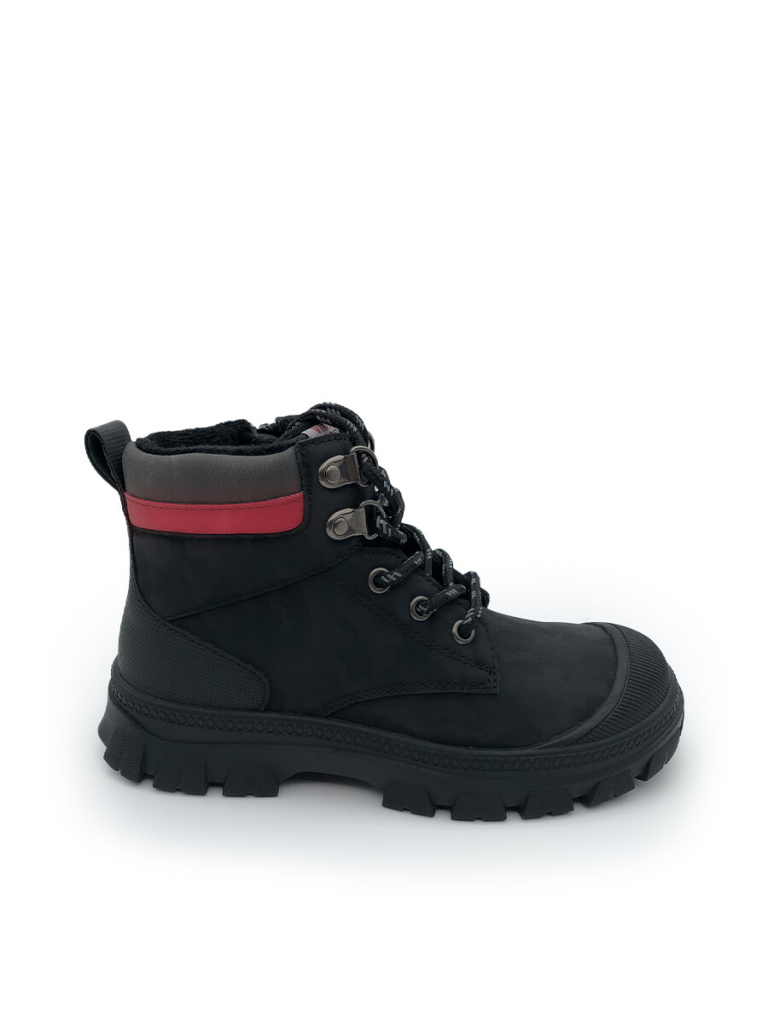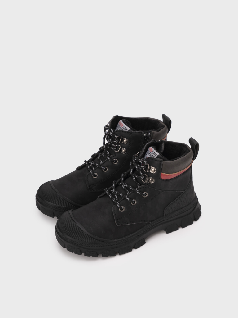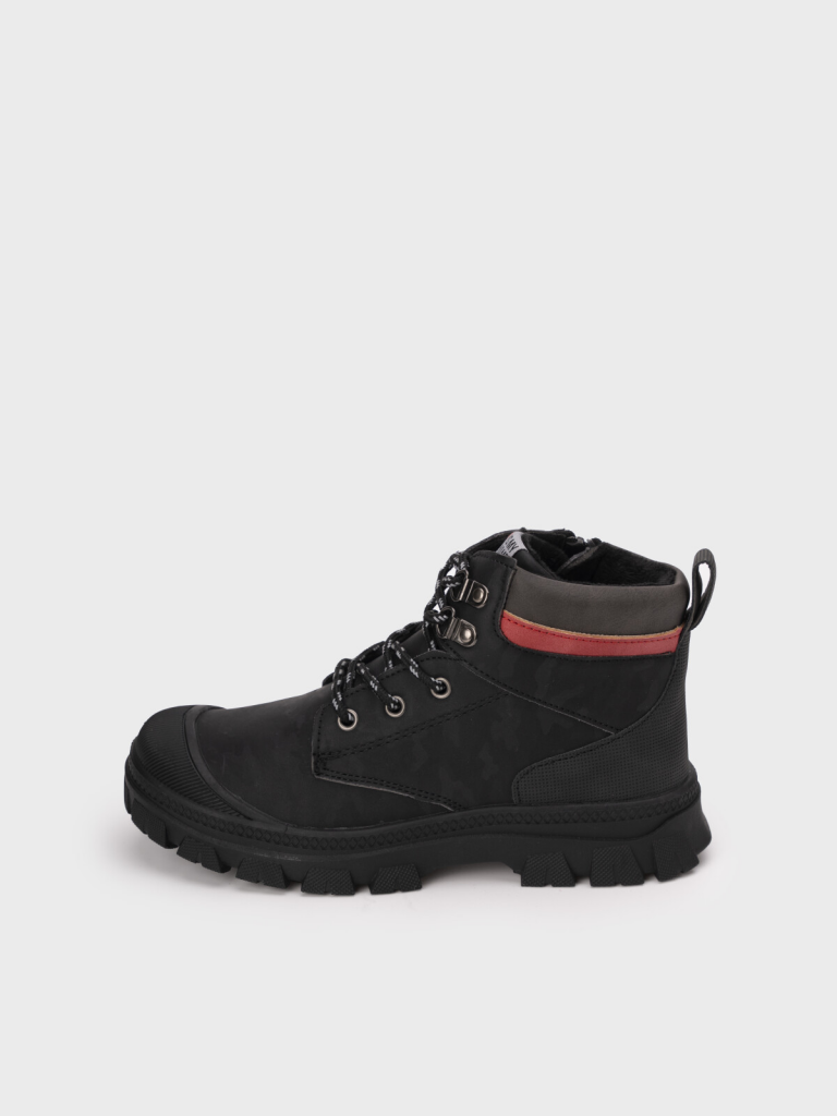 Ботинки на шнурках и молнии для мальчика подростка. Ботинки выполнены из искусственного нубука с принтом. Подкладка и съемная стелька выполнены из мягкого флиса. Формоустойчивый задник поддерживает стопу в правильном положении. Эргономичная форма колодки обеспечивает правильное формирование стопы ребенка. Модель имеет шнурки, с помощью которых регулируется подъем, и изнутри молнию для удобства обувания. Подошва с защитой носочной частью из облегченной терморезины не скользит и устойчива к истиранию. Рекомендованный температурный режим носки от +10°С до 0°С.