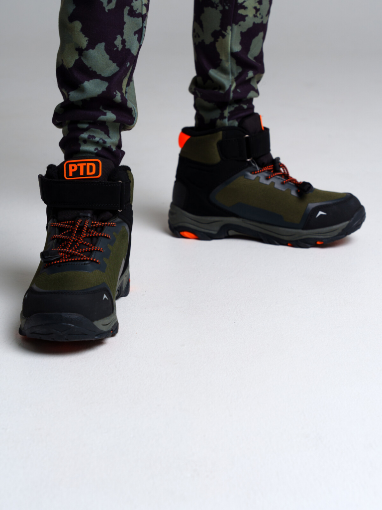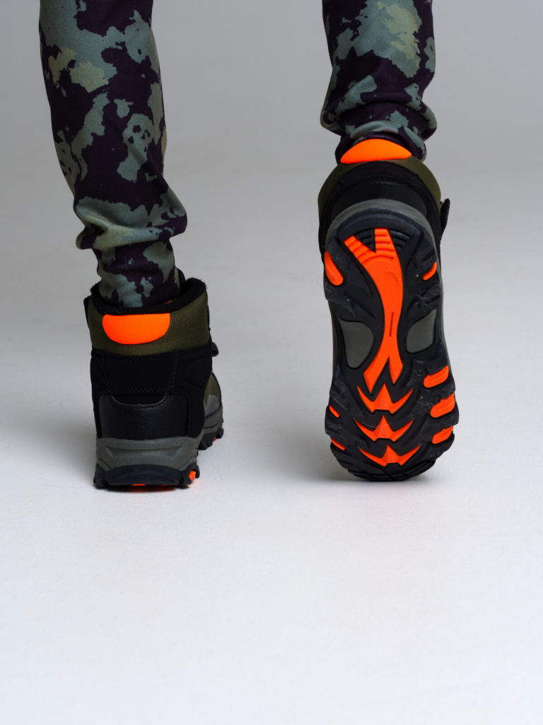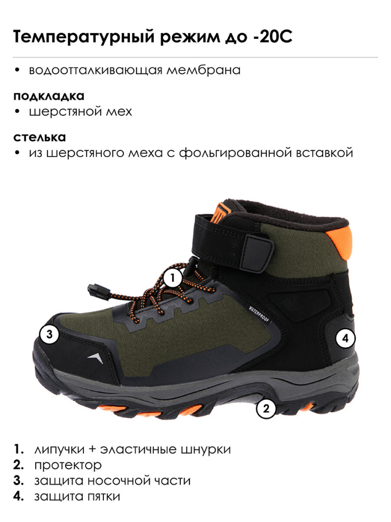 Конструкция верха изготовлена с использованием мембранных технологий. Усиленная защита носка и пятки специальными материалами. Подкладка и стелька выполнены из шерстяного меха 80%. Трехслойная стелька с фольгой, которая обеспечивает сохранение тепла в течение длительного времени. Формоустойчивый задник поддерживает стопу в правильном положении. Подошва имеет противоскользящий протектор. Удобная застежка-липучка и шнурок-утяжка. Рекомендованный температурный режим от 0°С до -20°С.