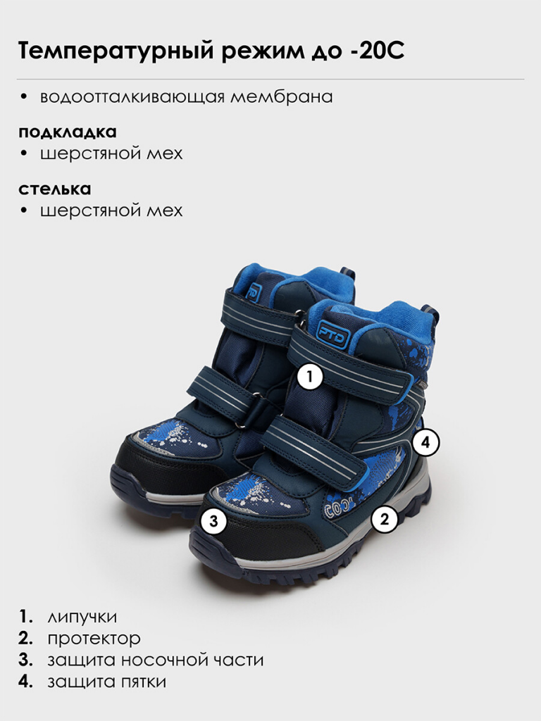 Ботинки детские зимние с мембраной для мальчика. Конструкция верха изготовлена с использованием мембранных технологий. Усиленная защита носка и пятки специальными материалами. Подкладка и стелька выполнены из шерстяного меха 80%. Трехслойная стелька с фольгой, которая обеспечивает сохранение тепла в течение длительного времени. Формоустойчивый задник поддерживает стопу в правильном положении. Подошва имеет противоскользящий протектор. Удобная застежка-липучка. Рекомендованный температурный режим ( зависит от активности ребенка и поддевы под обувь) ( зависит от активности ребенка и поддевы под обувь) от 0°С до -20°С.