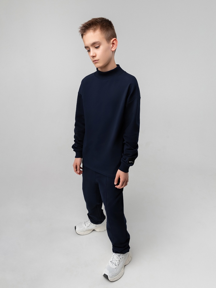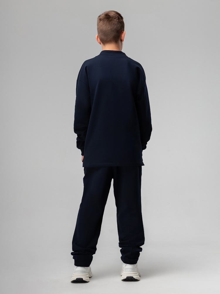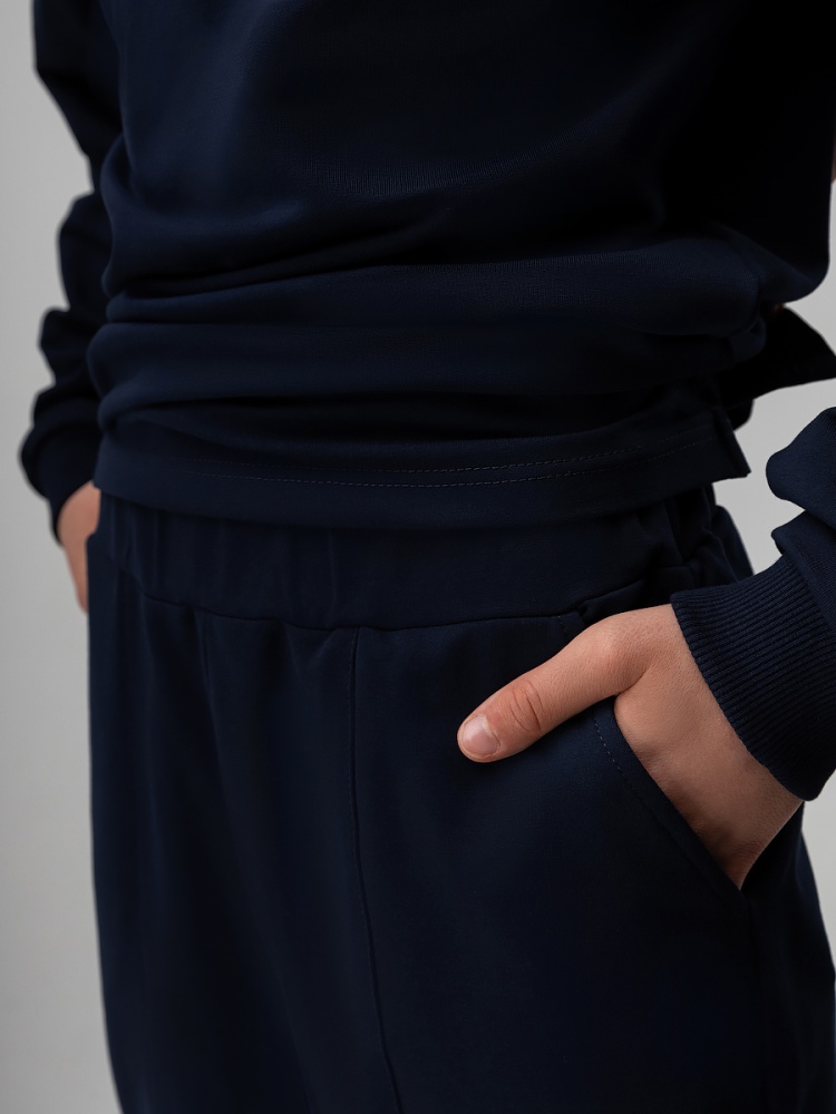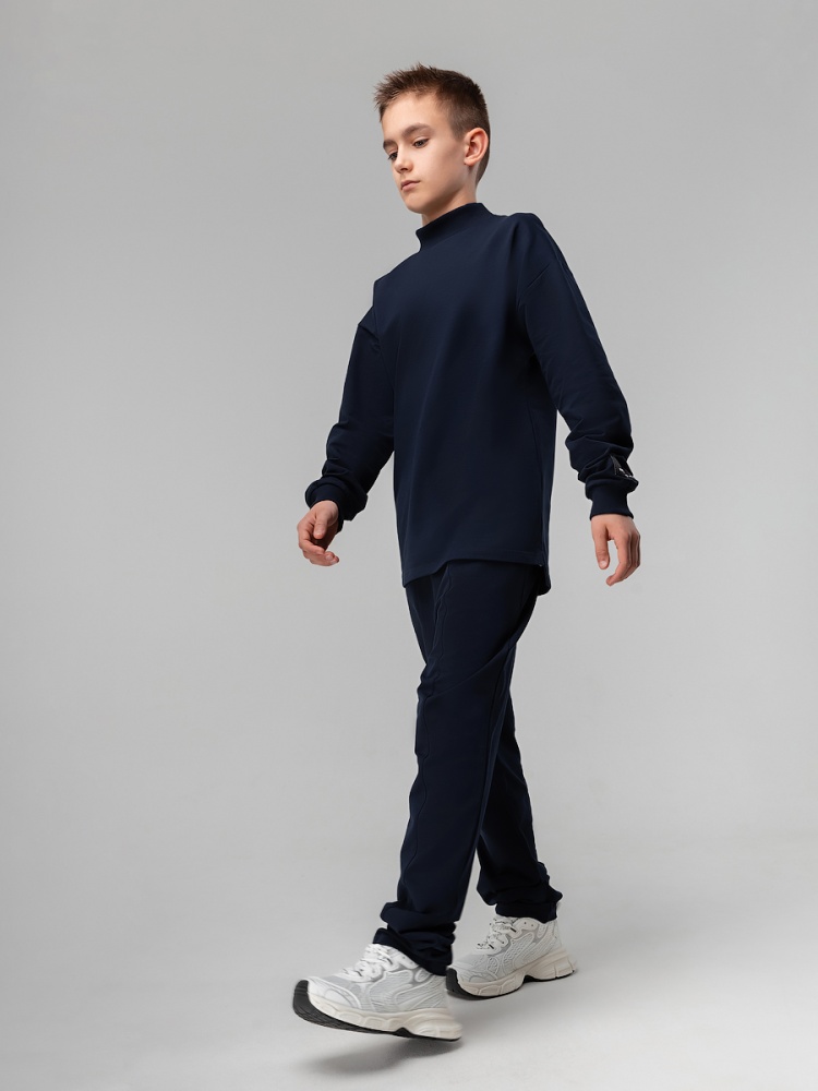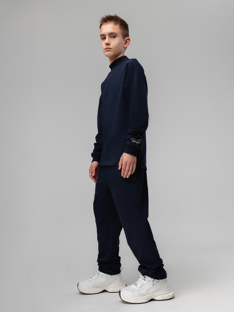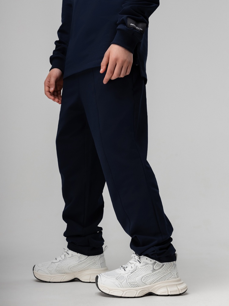 Брюки прямые слегка зауженные к низу брюки с боковыми карманами и задний карман на правой половине. Вертикальные рельефные отстрочки от талии до низа изделия и сзади от низа до колен.