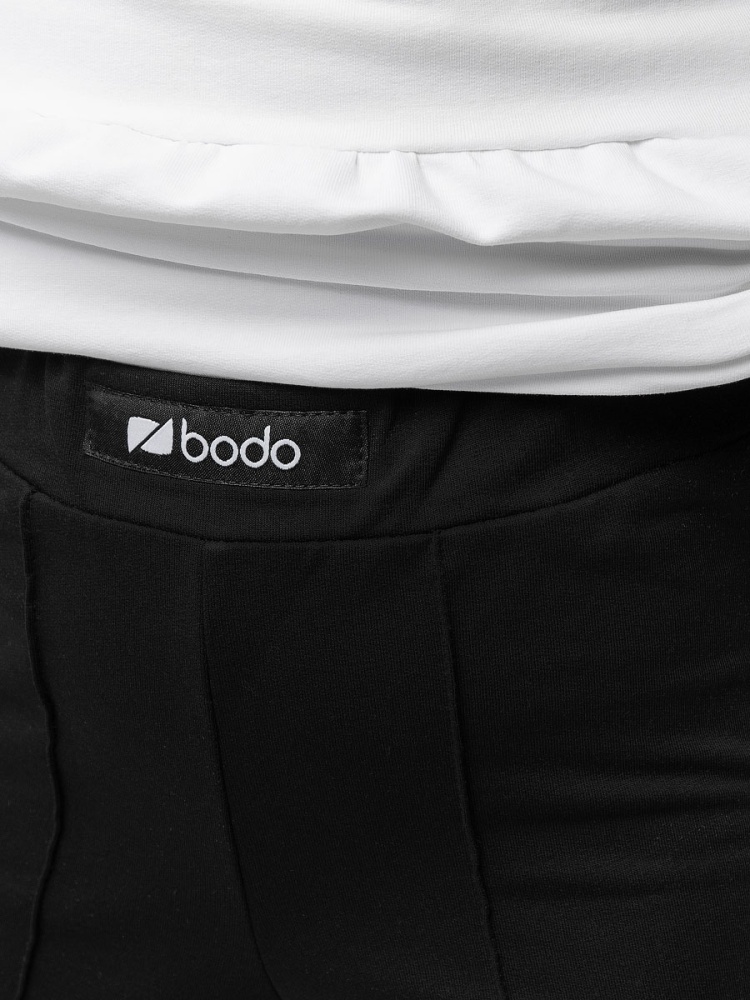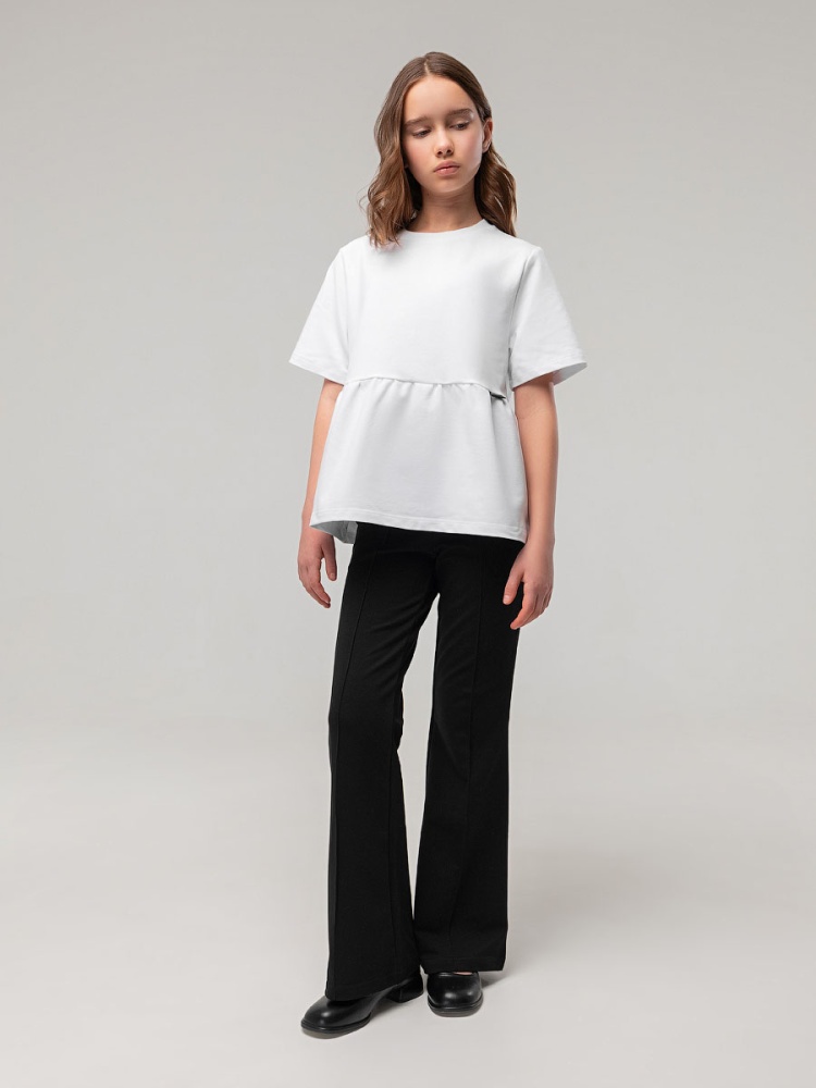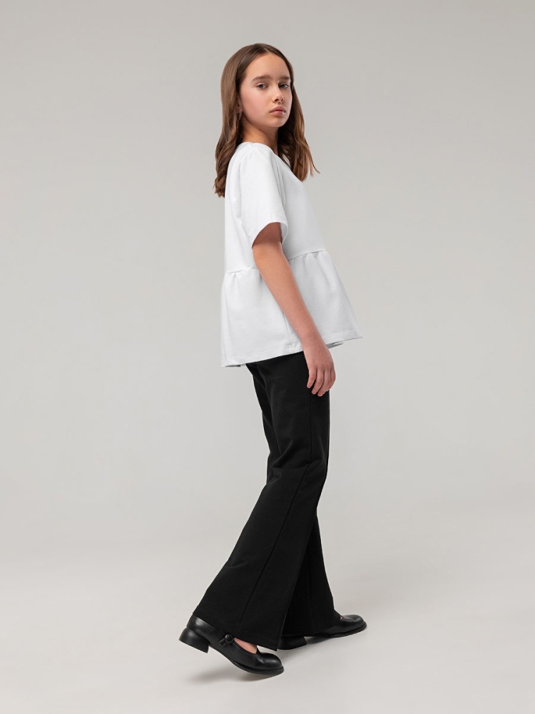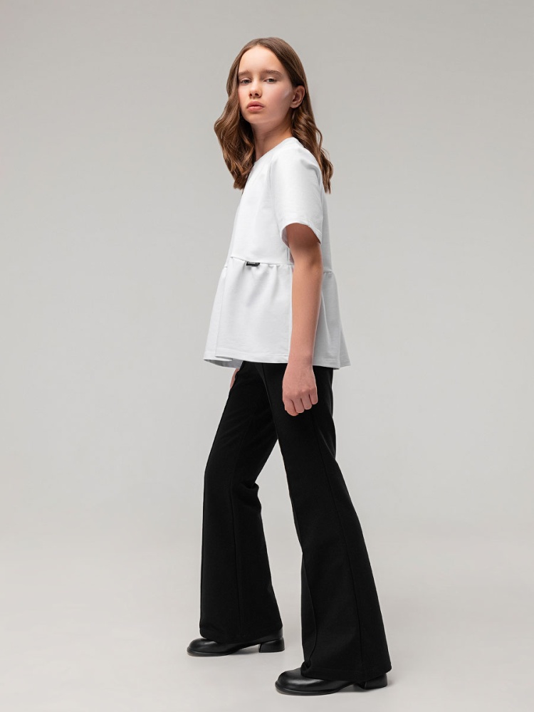 Брюки-клеш с вертикальными рельефами от талии до низа.