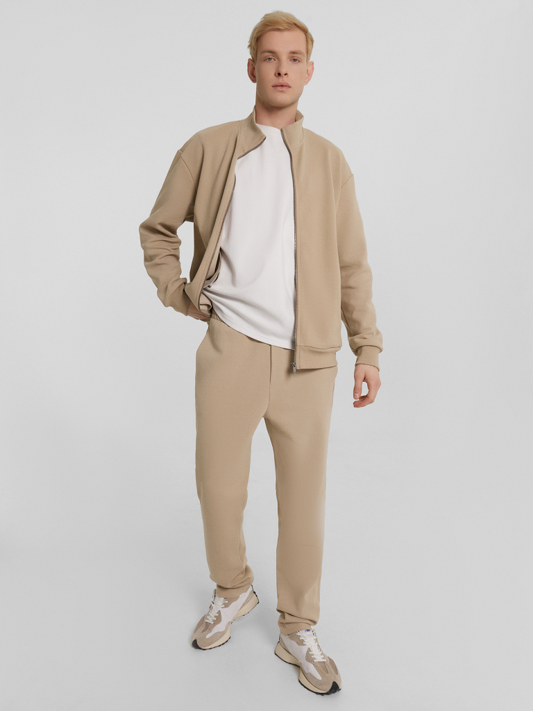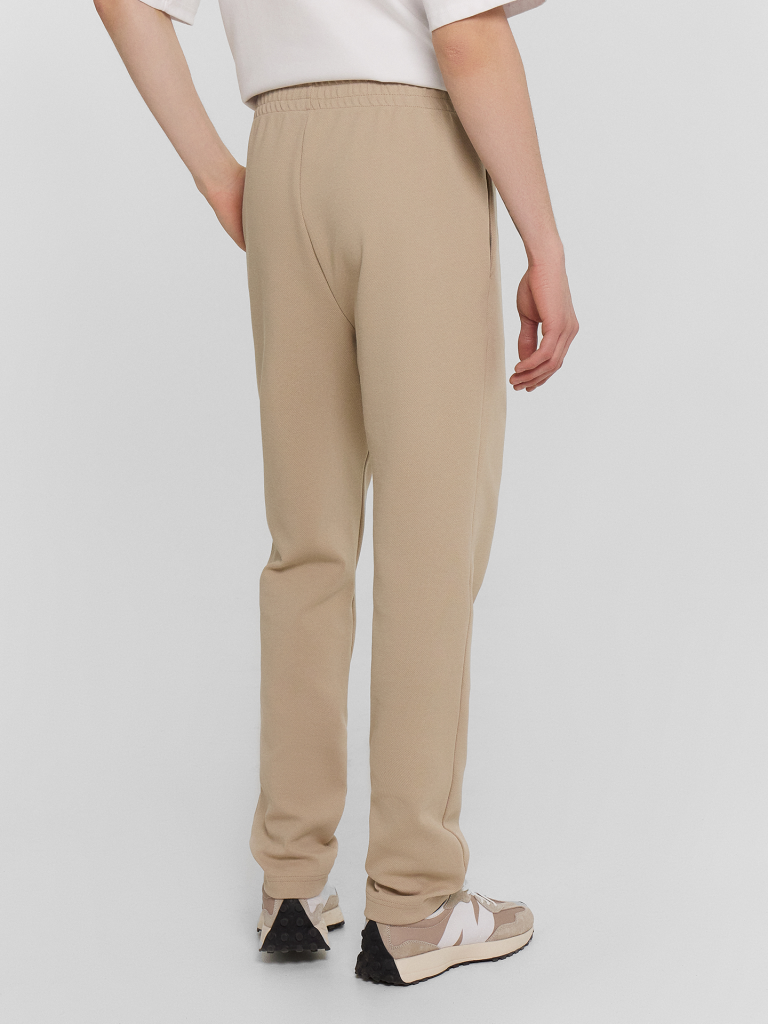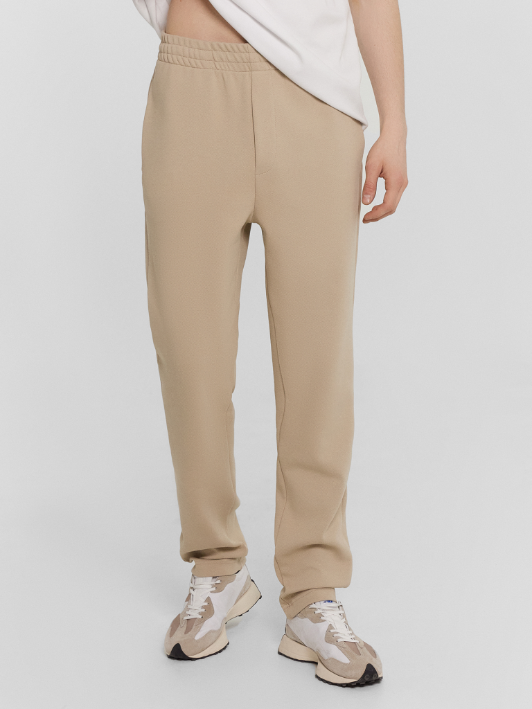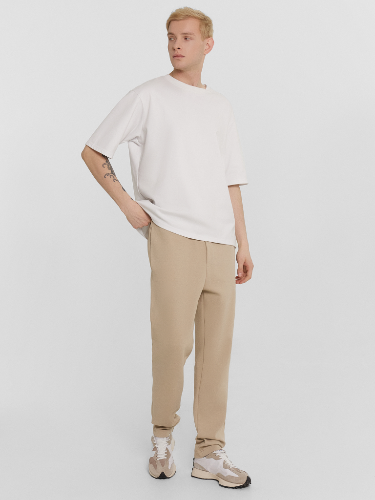 Длинные мужские брюки с классической линией талии, выполненные из интерлока. Силуэт прямой, штанины немного заужены к низу. В поясе – эластичная тесьма и регулировочный шнурок-завязка. Есть удобные боковые карманы. Стильно!