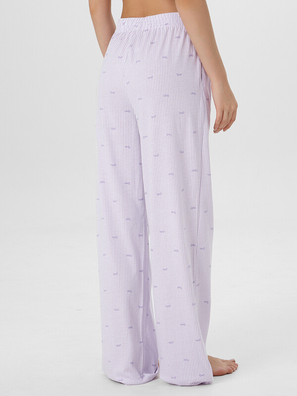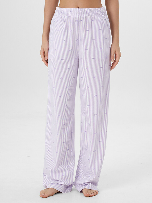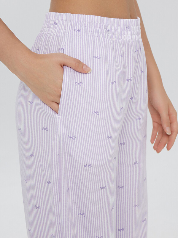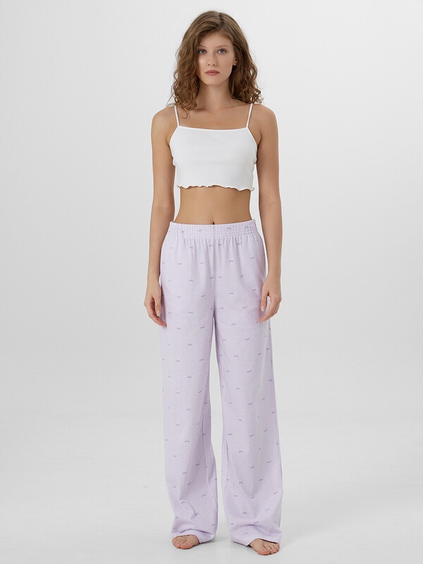 Брюки с посадкой на талии свободного силуэта. Пояс цельнокроеный с резиной внутри 40RV. В боковых швах карманы. Низ изделия застрочен швом в подгибку.