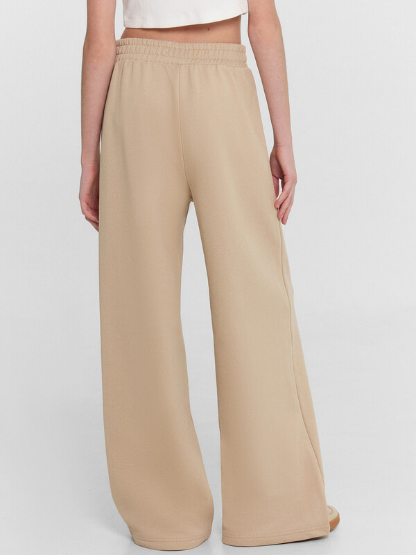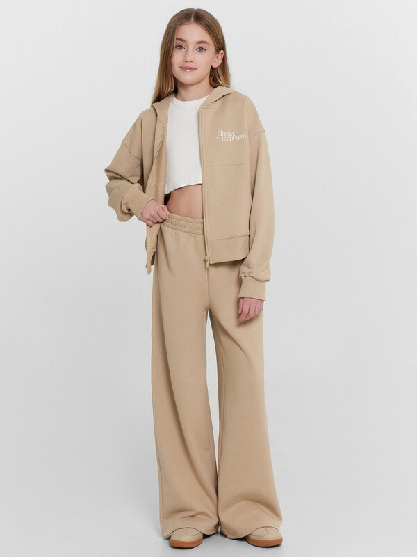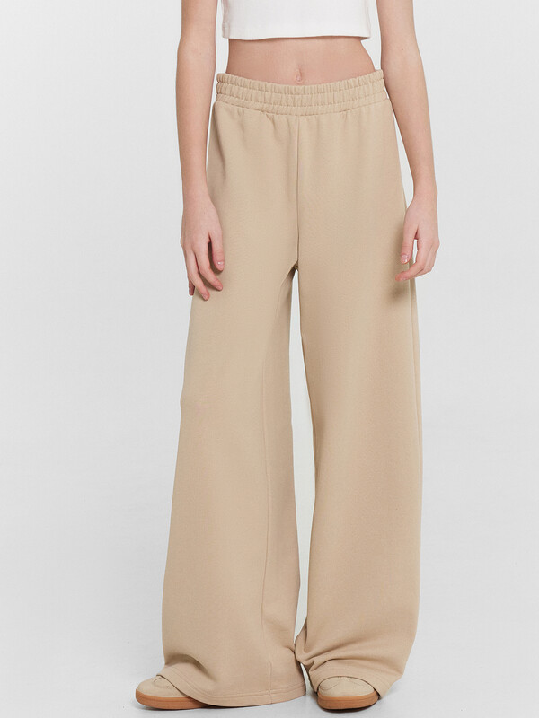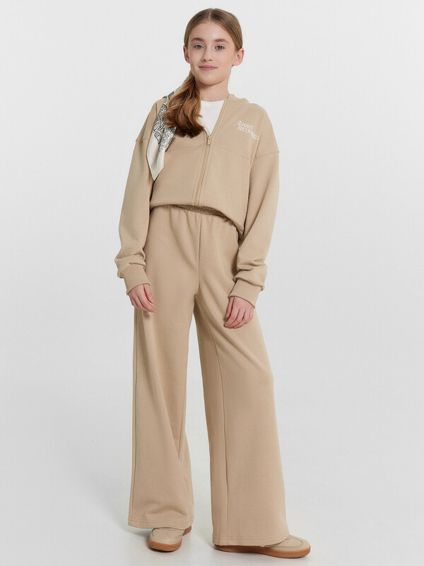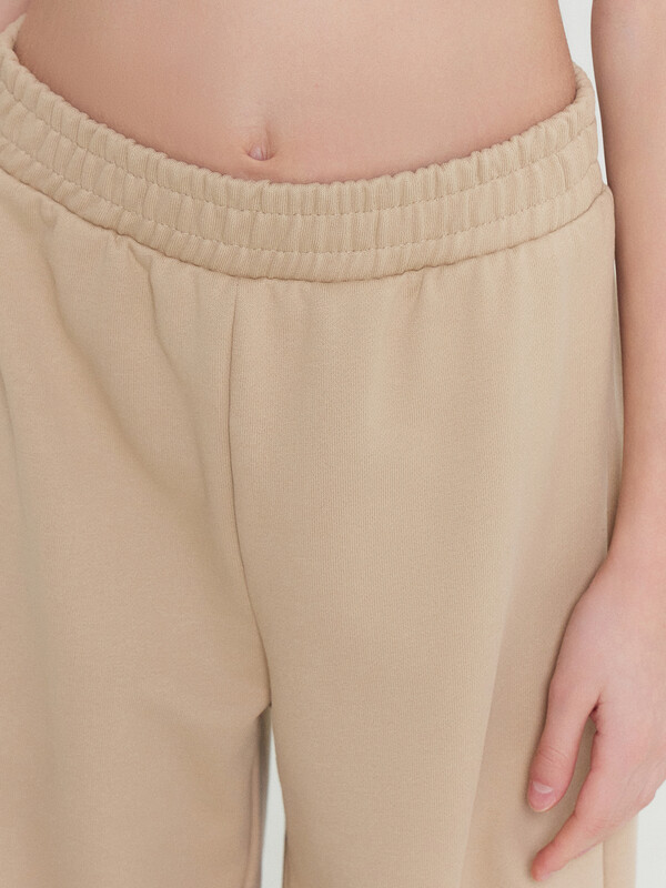 Брюки для девочек свободного силуэта. Пояс отрезной из основного полотна с эластичной тесьмой внутри 50RV. По поясу проложены отделочные строчки. Низ брюк обработан швом в подгибку.