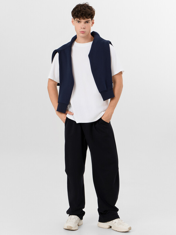 Мужские брюки из хлопка — это уют и свобода движений. Модель прямого свободного кроя не сковывает и идеально подходит для повседневной носки. Пояс с эластичной резинкой внутри и шнурком позволяет легко регулировать посадку по талии.