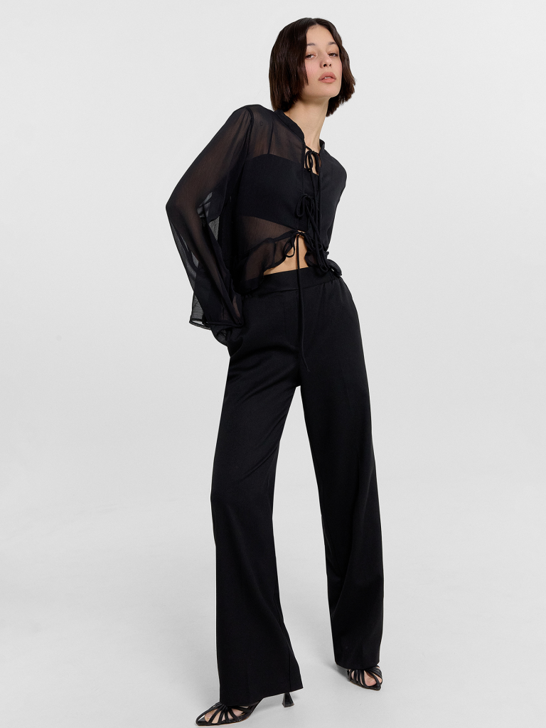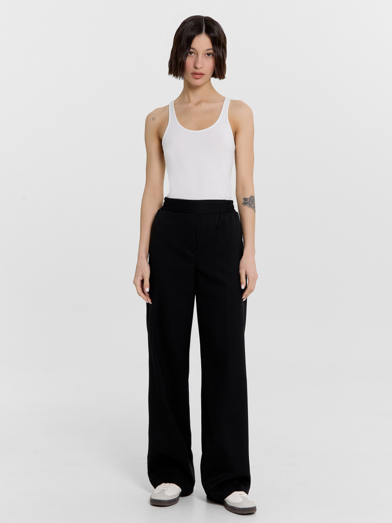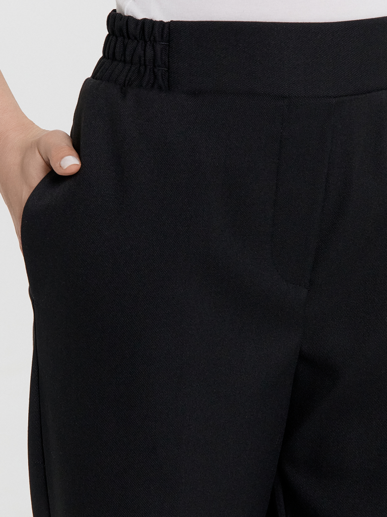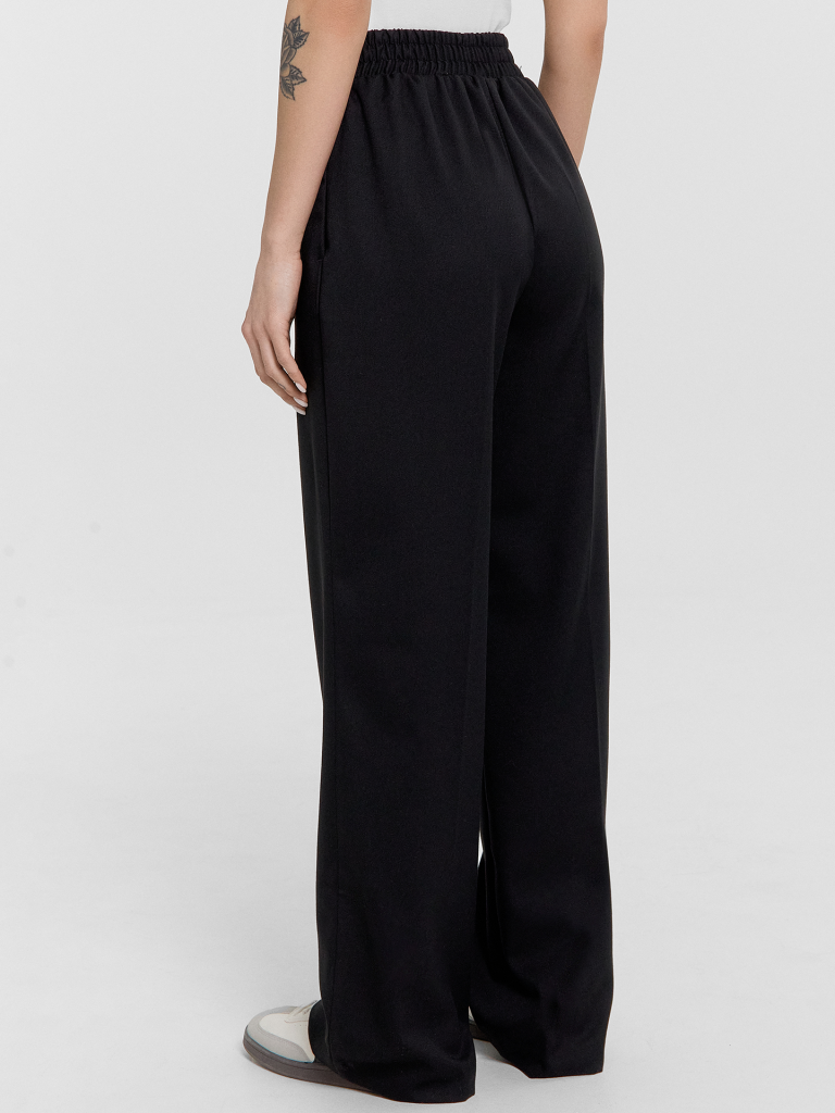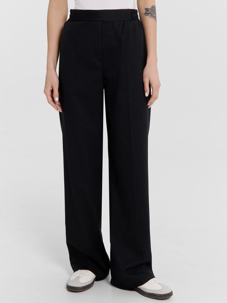 Эти женские прямые свободные брюки — отличный выбор для стильных и комфортных образов. Высокая посадка визуально удлиняет силуэт, создавая элегантные пропорции, а частично эластичный пояс обеспечивает удобную посадку и адаптацию к фигуре. Задняя часть пояса с эластичной тесьмой внутри добавляет комфорт и мягкость прилегания, делая брюки идеальными для длительного ношения. Боковые карманы в швах добавляют функциональности. Спереди декоративная строчка имитирует гульфик, придавая брюкам классический, завершенный вид. Нижний срез обработан швом вподгибку, что добавляет аккуратности и долговечности. Изделие выполнено из смесового материала с добавлением вискозы, что делает ткань легкой, приятной к телу и удобной в носке. Эти брюки идеально сочетаются с различными элементами гардероба, создавая элегантные повседневные и деловые образы. Универсальная модель для тех, кто ценит комфорт и стиль!