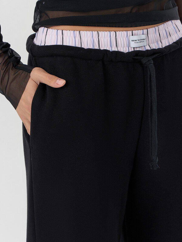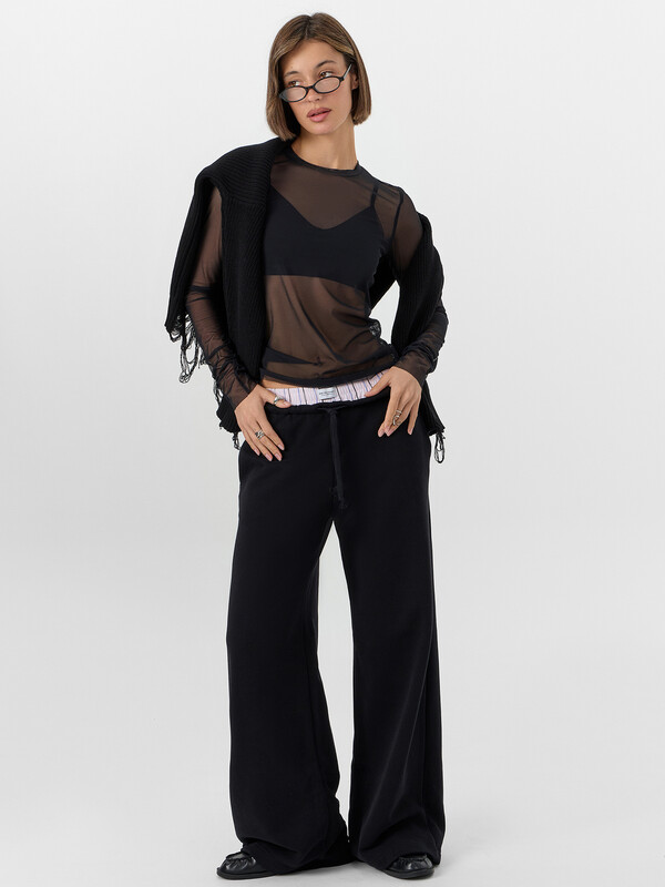 Черные женские брюки прямого свободного кроя сочетают в себе повседневный комфорт и изысканную деталь. Модель со средней посадкой дополнена изящным декоративным элементом по верхнему срезу — тонкой текстильной вставкой, стилизованной под край нижнего белья. Эта деликатная деталь придает образу игривую нотку и особый шарм, оставаясь при этом тактично скрытой под одеждой.