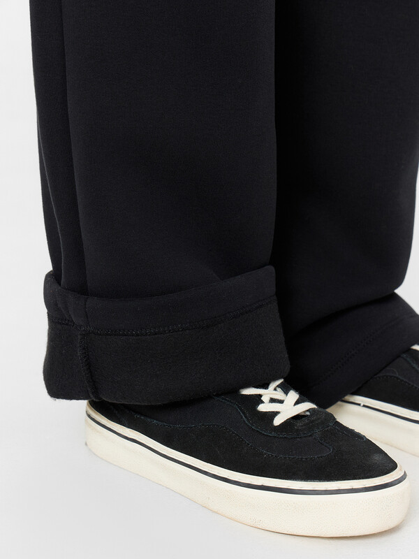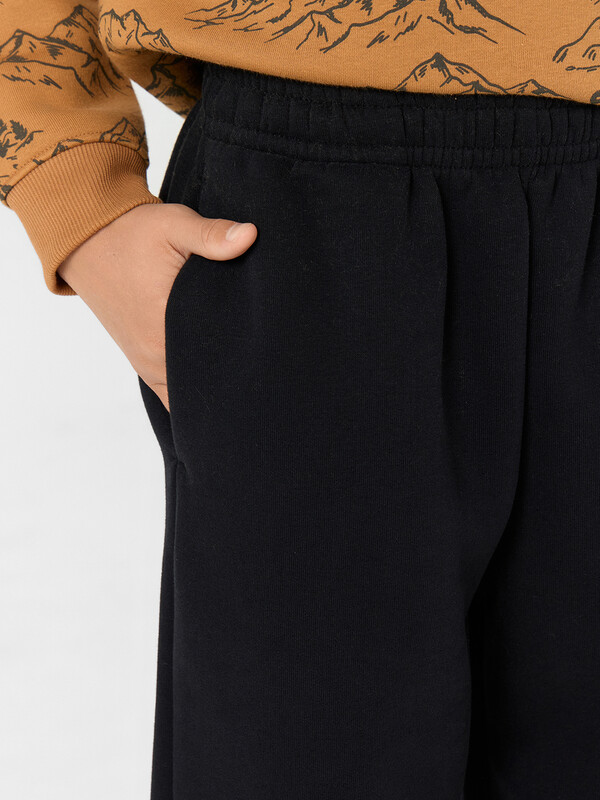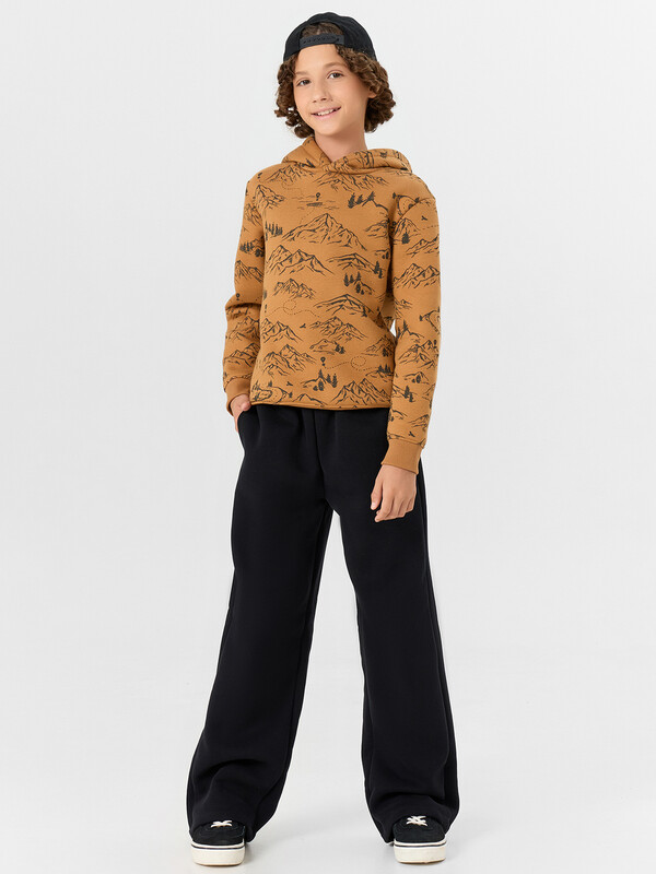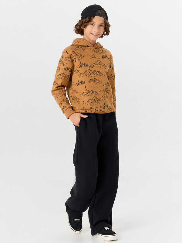 Брюки для мальчиков, прямого силуэта. Пояс цельнокройный с втачной эластичной тесьсьмой. Пояс прострочен двумя отделочными строчками. По переду обработаны карманы в швах. Низ брюк обработан швом в подгибку на двухигольной плоскошовной машине.