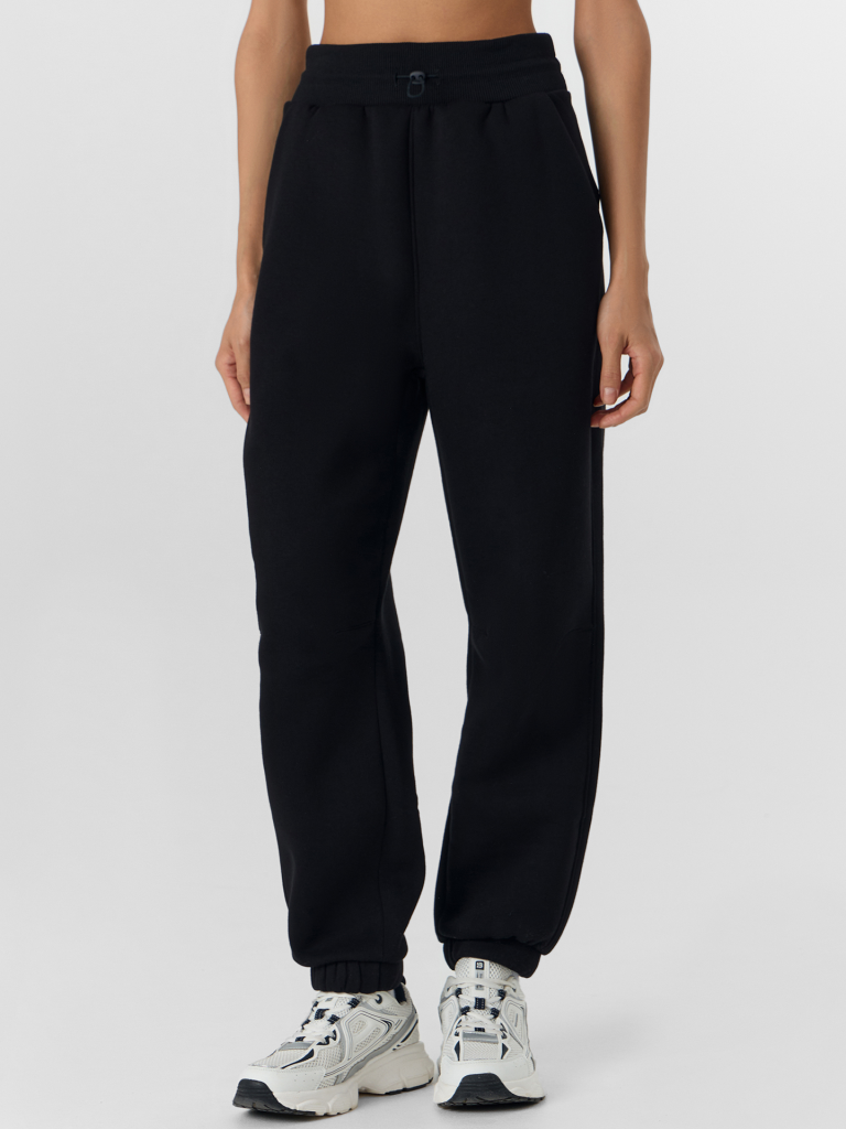 Черные спортивные брюки с начесом — это уют и комфорт для отдыха или занятий спортом. Они выполнены из мягкого, плотного трикотажа, который хорошо сохраняет тепло и приятен на ощупь. Свободный силуэт и эластичные манжеты внизу обеспечивают полную свободу движений и аккуратную посадку.