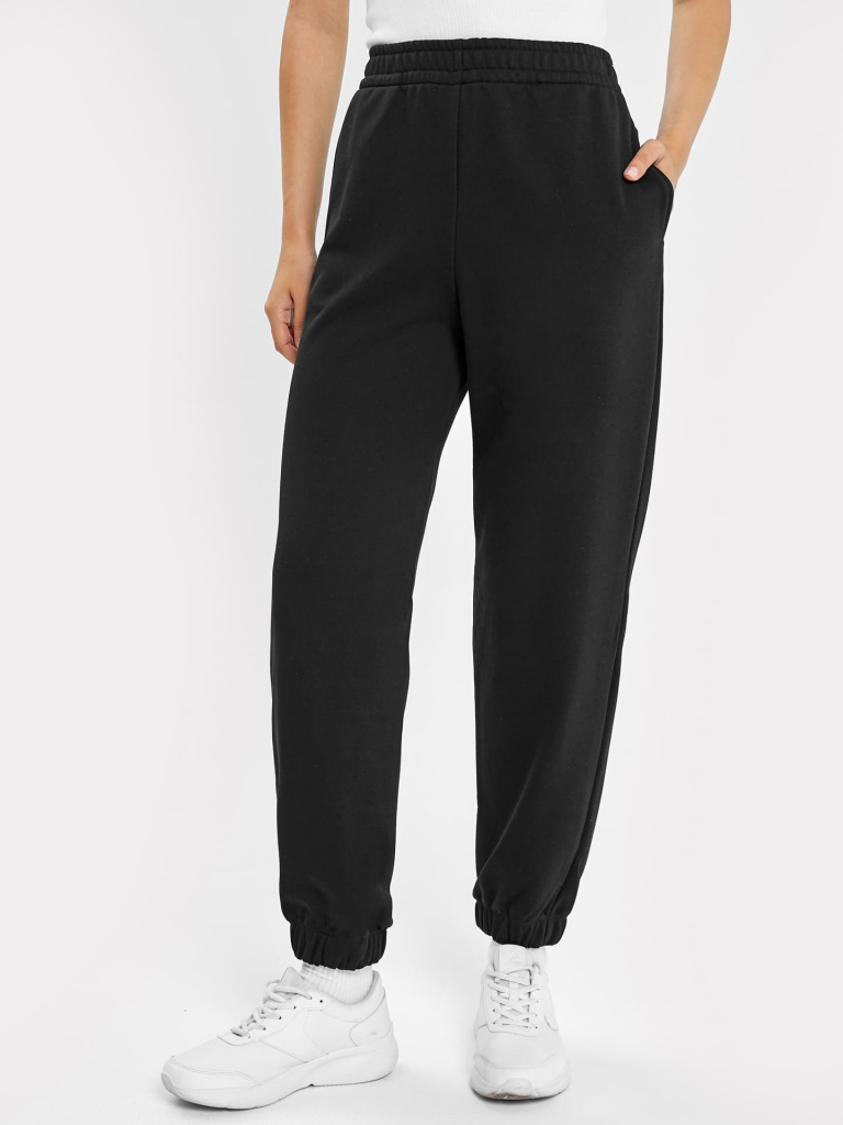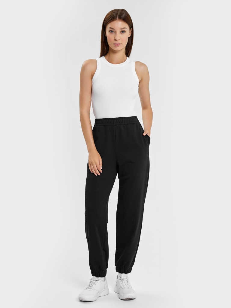 Брюки изготовлены из трикотажного полотна футер. Брюки прямые. свободные. Пояс цельнокроеный с эластичной тесьмой внутри. В боковых швах расположены карманы, подкладка из основного полотна. Низ брюк обработан швом в подгибку с эластичной тесьмой внутри.