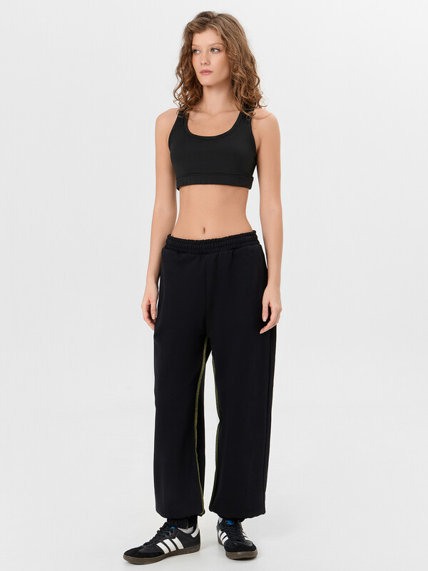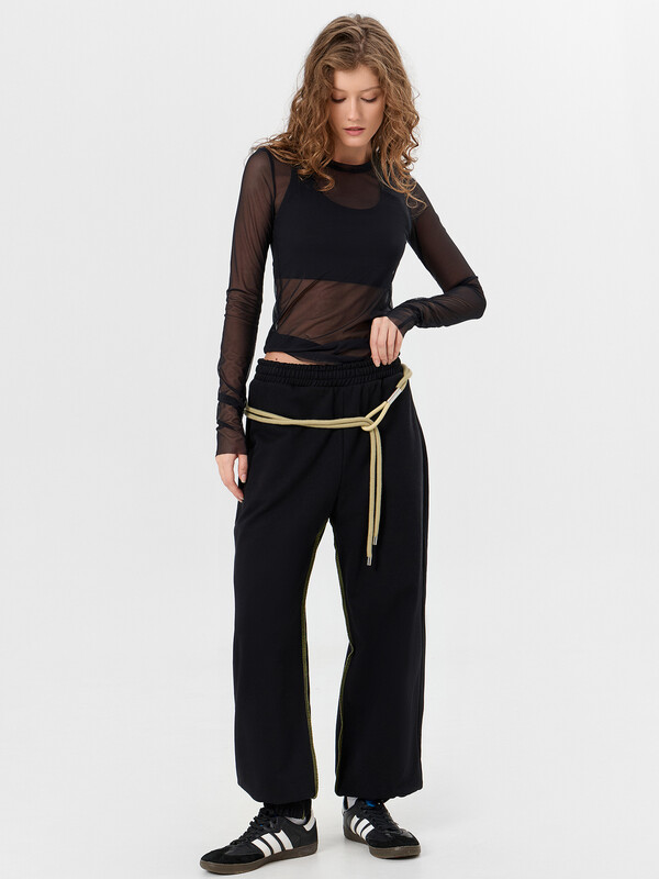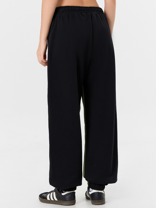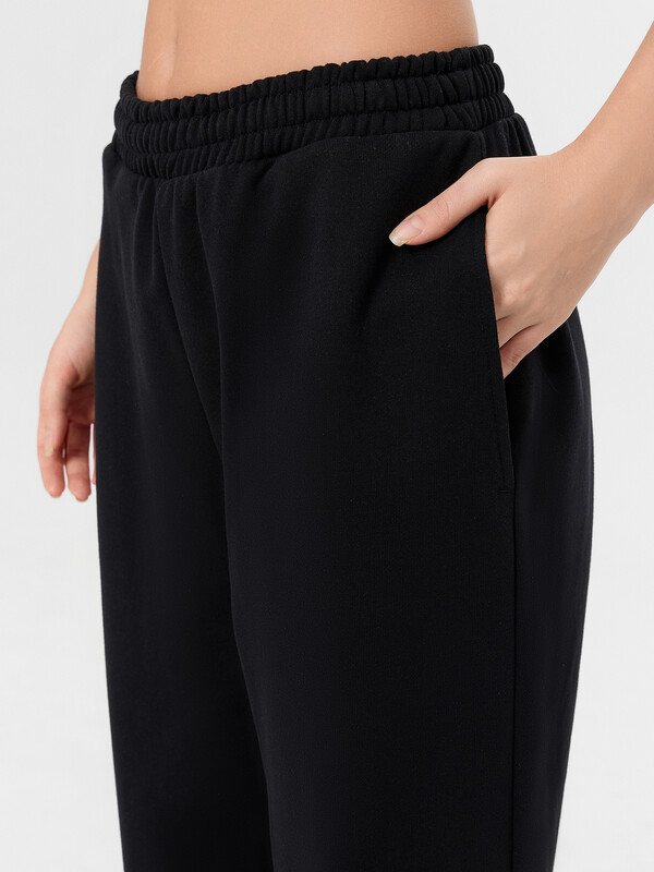 Черные женские брюки-джоггеры свободного кроя — это современная модель для повседневной носки. Брюки с отрезным поясом и эластичной резинкой обеспечивают удобную посадку по талии. Дополнительный шнурок позволяет индивидуально регулировать степень прилегания. В боковых швах расположены удобные карманы с подкладкой из основного материала.