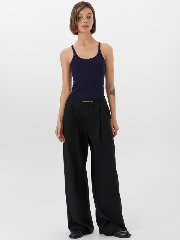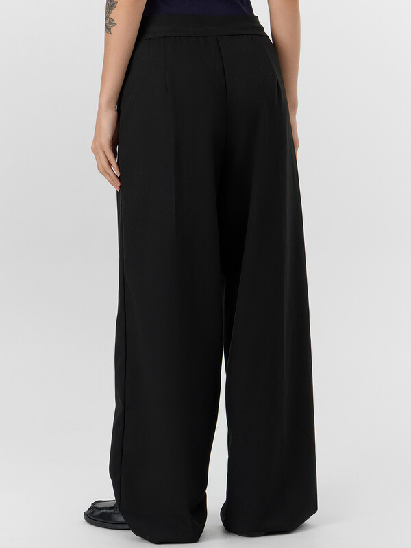 Брюки женские выполнены из текстиля. Брюки прямые, свободного силуэта. Посадка средняя, сидение опущено. По верхнему срезу притачана эластичная тесьма жаккард 50мм (JT1-50). По переду заложены складки. На правой передней детали имитация гульфика. На задних половинках застрочены вытачки. В боковых швах обработаны карманы. Подкладка из основного полотна. Брюки со стрелками. Нижние срезы обработаны швом вподгибку.