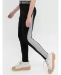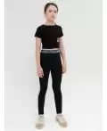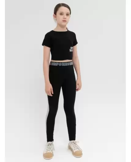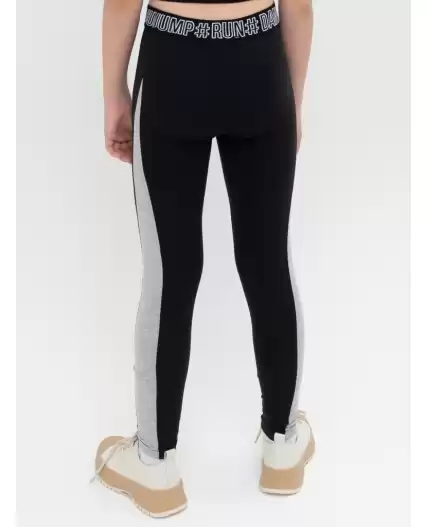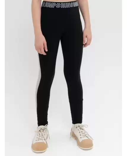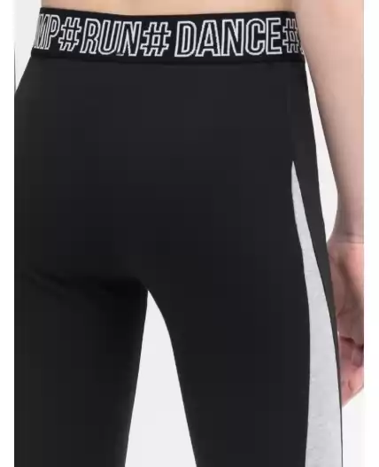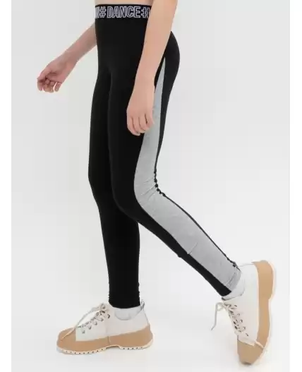 Трикотажные лосины для девочек. Плотные и эластичные. Не ограничивают движения. Прыгай, бегай, садись на шпагат и забирайся по канату они выдержат всё! По бокам лосин вставки из ткани контрастного цвета. Широкий мягкий пояс с мотивирующим текстом #Танцуй#Прыгай#Бегай (перевод) не будет сдавливать живот и врезаться в кожу. В этих лосинах быть стильной можно и на физкультуре, и на тренировке, и на прогулке.