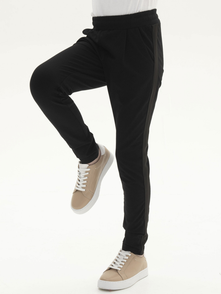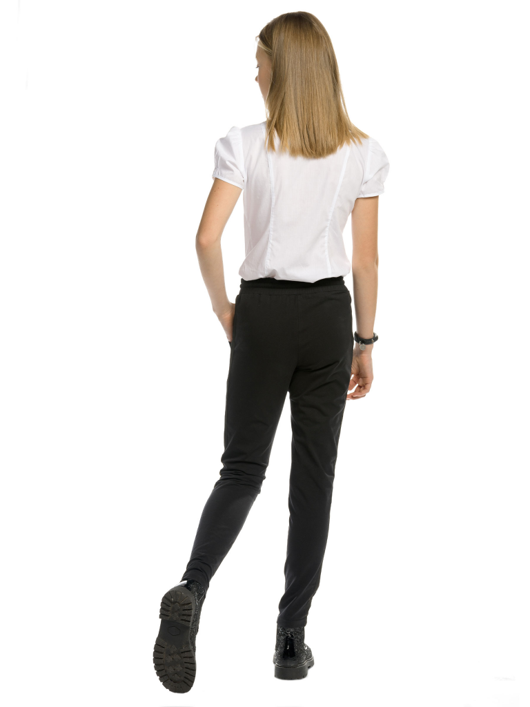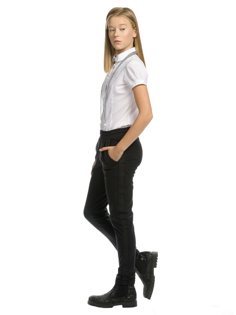 Брюки в стиле кэжуал то, что нужно современной девчонке. Боковые карманы имеют достаточный объем, чтобы прятать телефон, жевательные конфеты и записки от одноклассников. Мягкий хлопковый трикотаж с добавлением эластана не стесняет движений. Крой в зоне бедер имеет небольшой запас, а пояс на резинке с потайным шнурком позволяет регулировать размер. Трендовые лампасы в тон задают смелый и чуточку дерзкий голос всему образу модницы.