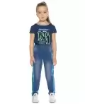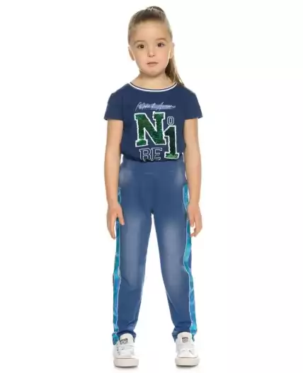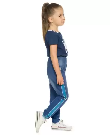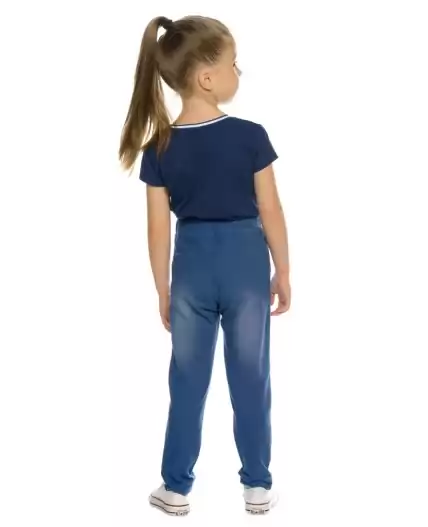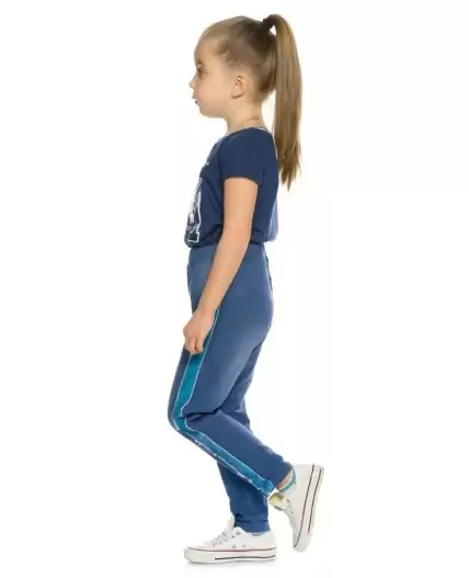 Ультрамариновые джеггинсы силуэта бананы - свободный объем сверху и зауженные книзу. Пояс на широкой внутренней резинке, с дополнительной регулировкой шнурком. По переду имитация карманов, вдоль боковых швов лампасы из переливающихся переворачивающихся пайеток.