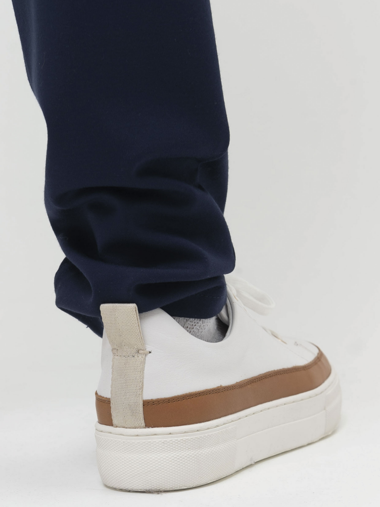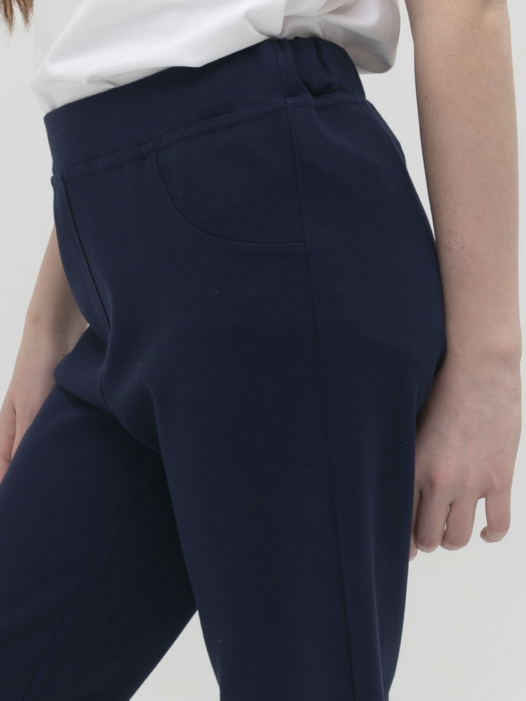 Привычная классика в новом прочтении. Актуальная модель базовых брюк выполнена из плотного трикотажного материала, декоративная строчка имитирует карманы и гульфик, а нетривиальная цветовая палитра добавляет новизны знакомому изделию. Удобный пояс на резинке дополняет внутренний шнурок для регулировки объема. Благодаря цельному крою, брюки не топорщатся, а идеально сидят по фигуре. Прилегание в бедрах и прямой покрой штанин от колена вытягивают силуэт и делают брюки универсальными в сочетаниях с другими предметами гардероба.