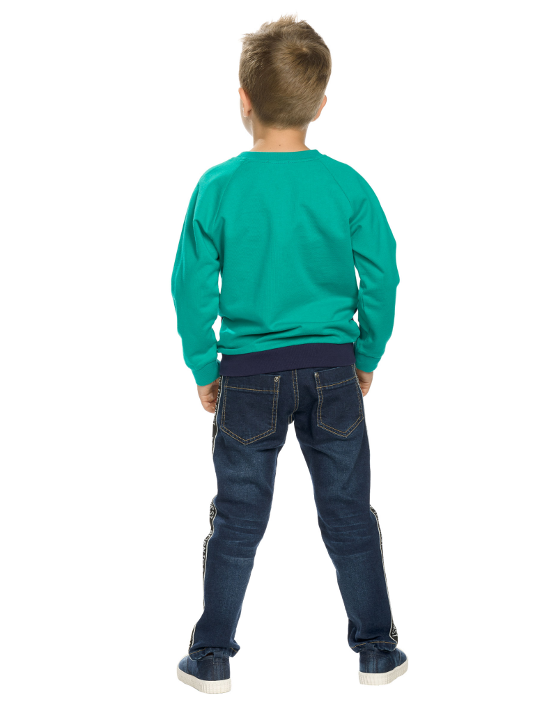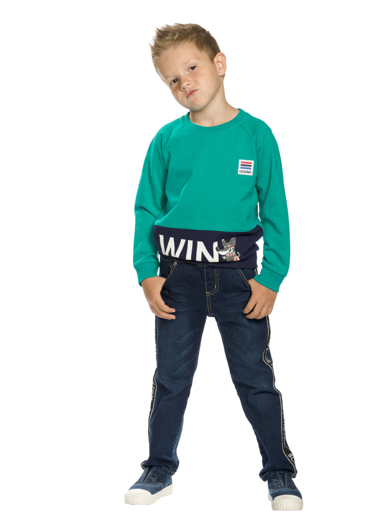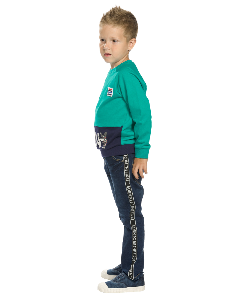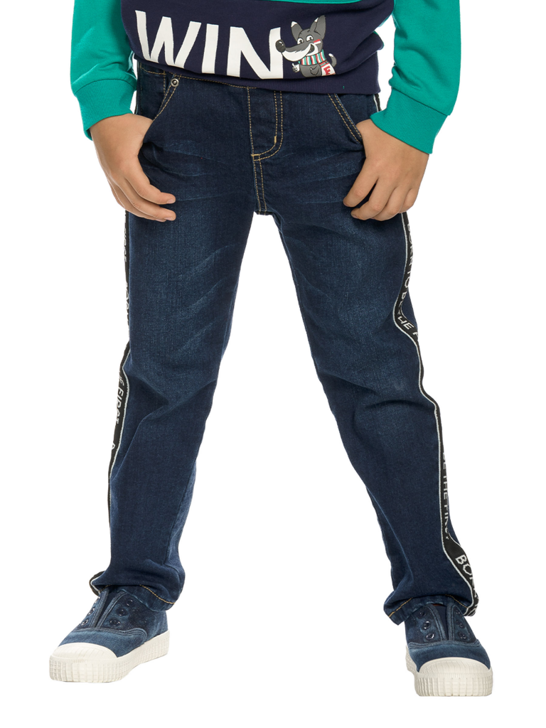 Брюки для мальчиков. Джинсы с начёсом, небольшого объёма, заужены к низу: пояс из рибаны с регулировкой ширины: по боковому шву лампасы из тесьмы с надписью "Рождён быть первым".