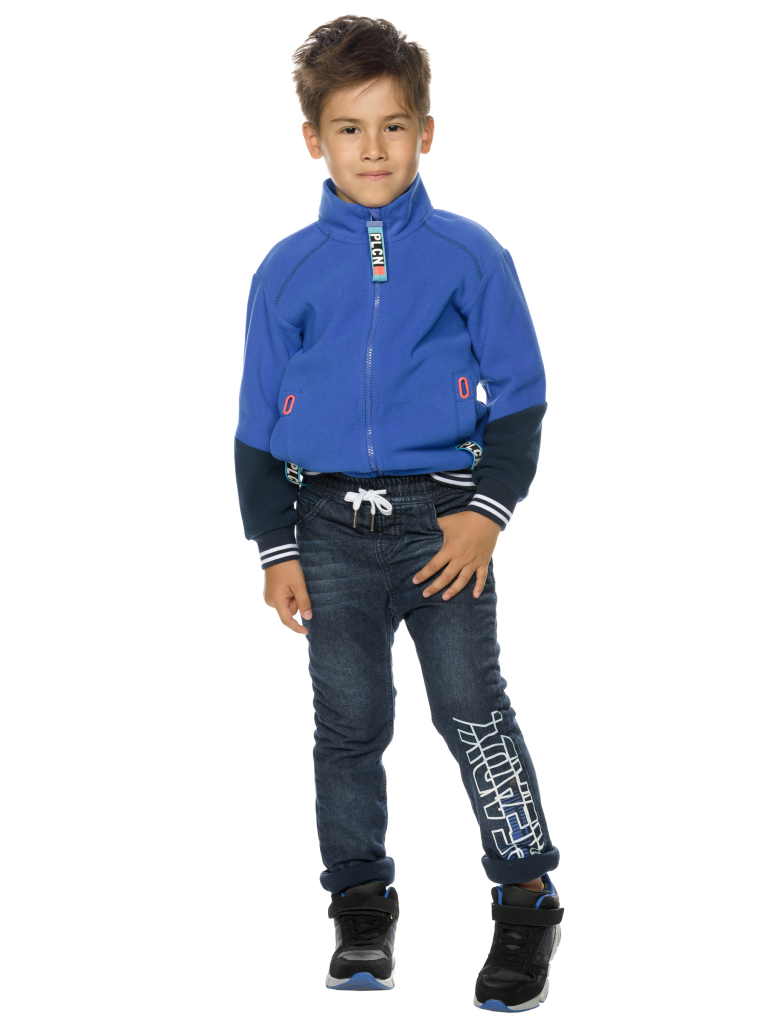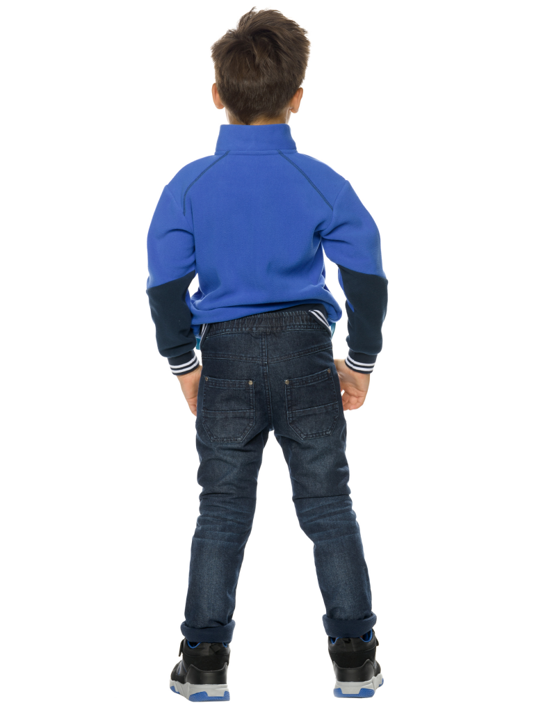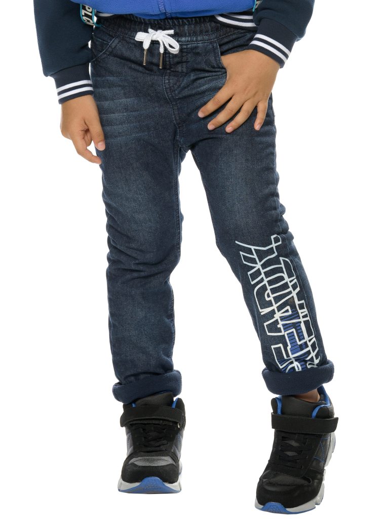 Джинсы для мальчиков на флисе умеренного объёма, слегка зауженные к низу, локальный принт с надписью Готов, пояс с регулировкой объема на широкой внутренней резинке, металлическая фурнитура.