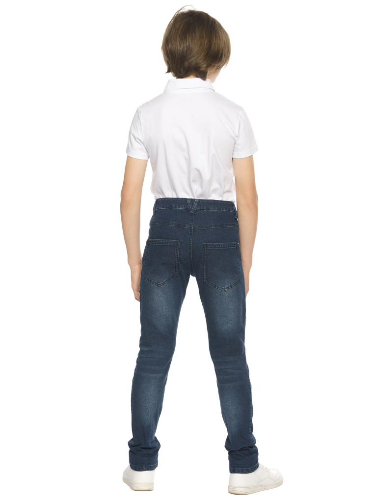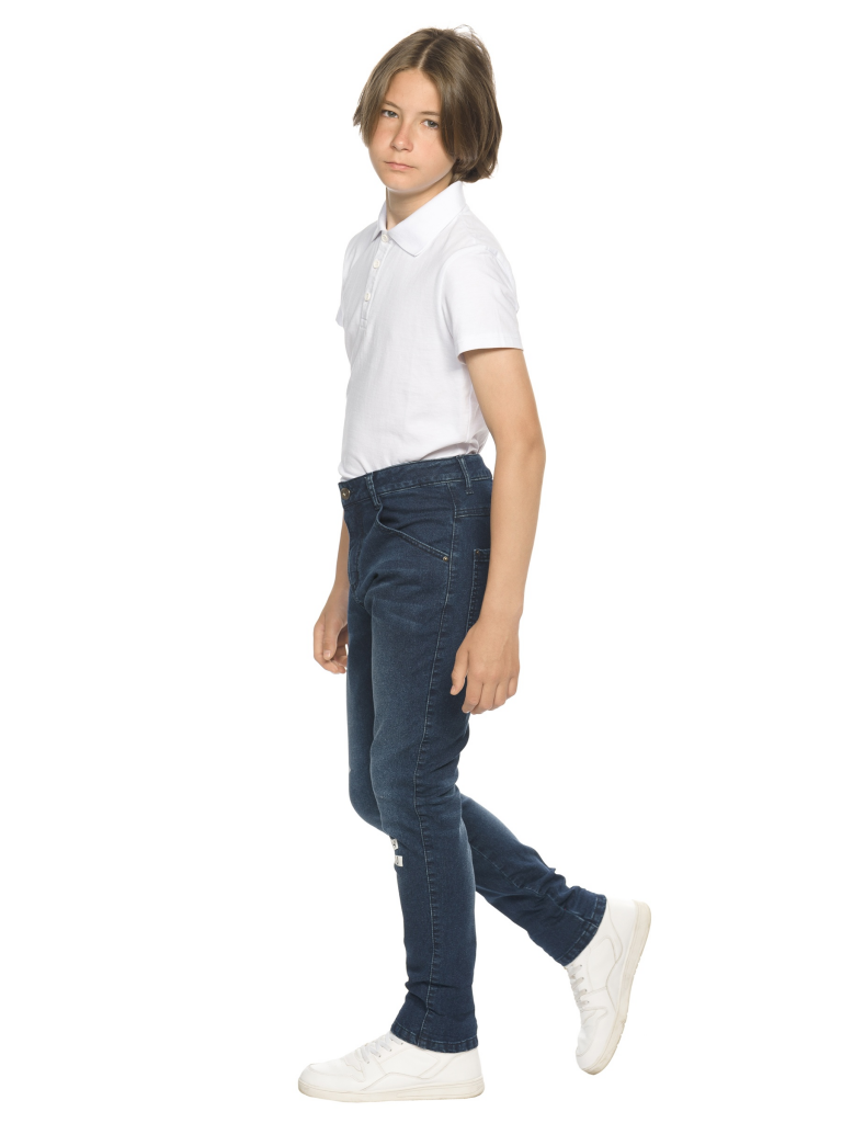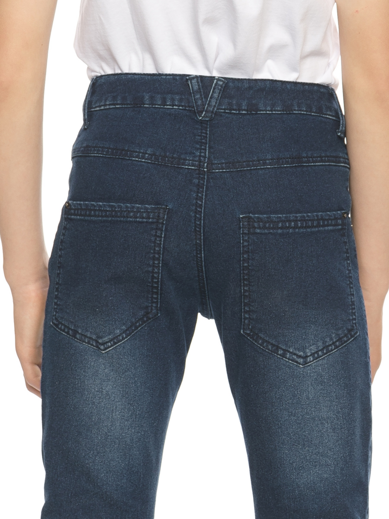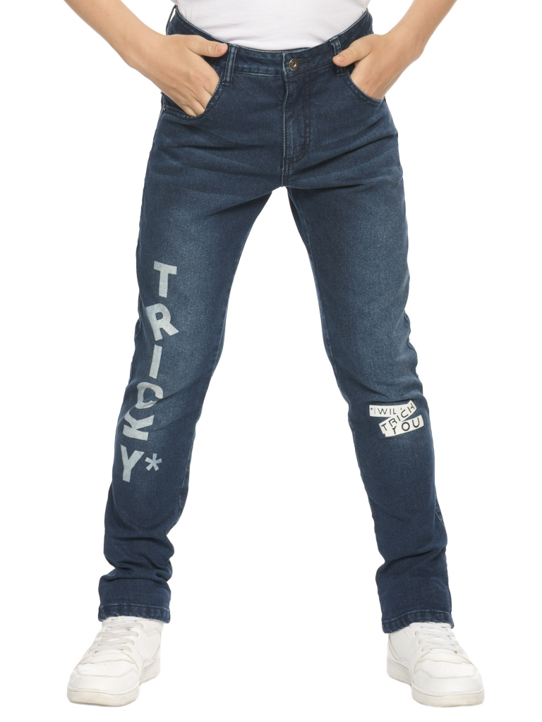 Утепленные джинсы для мальчиков умеренного объёма с 5 ю карманами и металлической фурнитурой. На правой брючине мягкий принт, надпись Хитрый, на левой rubber принт, надпись Я обхитрю тебя. Пояс из рибаны с дополнительной регулировкой внутренним шнуром.