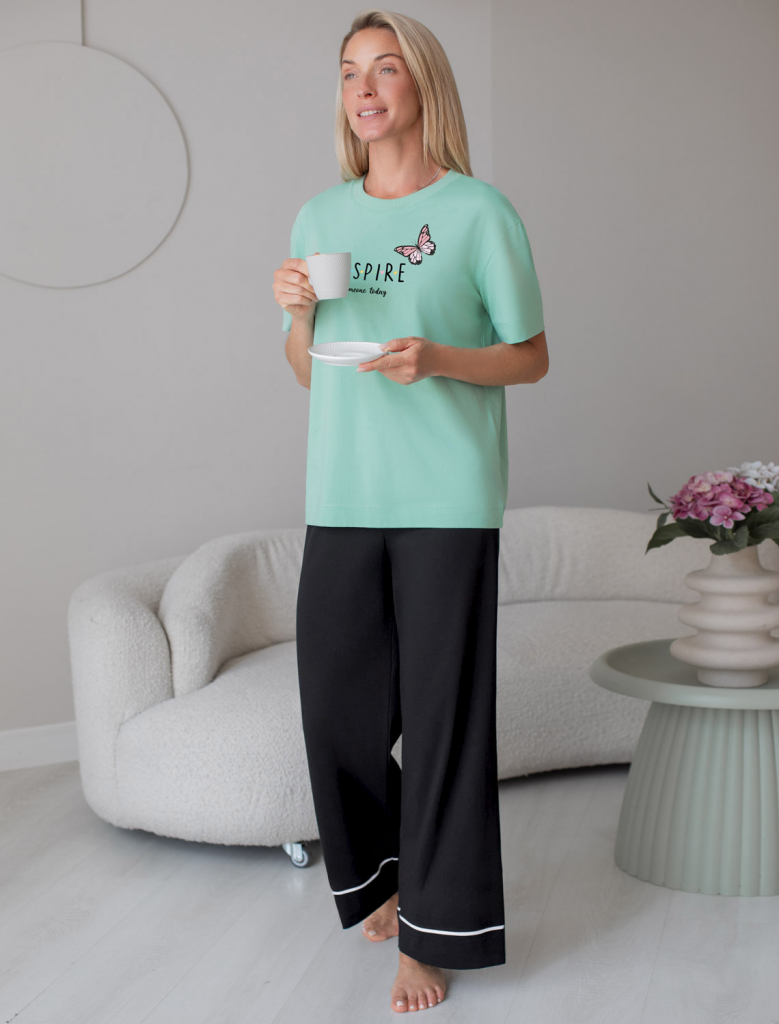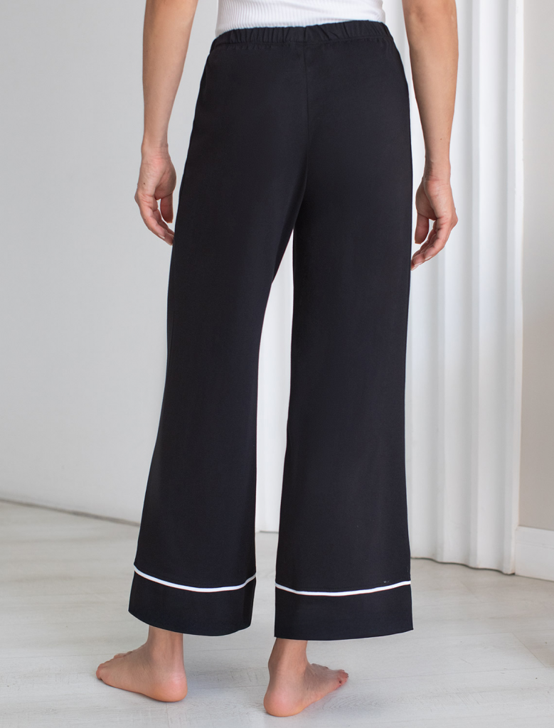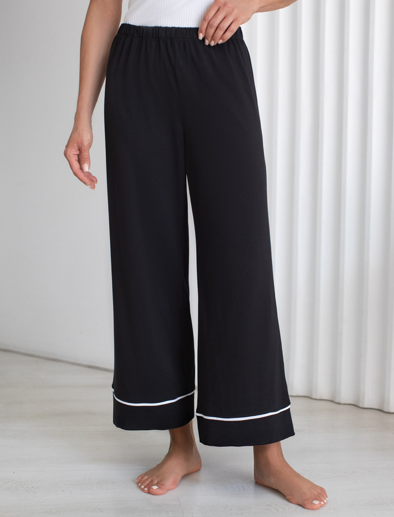 Укороченные брюки практичного черного цвета из мягкого эластичного хлопка подарят вам комфорт в любое время дня. Прямой крой обеспечивает свободу движений и удобство при носке. Материал приятен на ощупь, хорошо пропускает воздух и позволяет коже дышать, делая эти брюки идеальным выбором для повседневной носки. Широкие брюки прекрасно подойдут на женщин с фигурой плюс сайз, на высокий рост и на девушек низкого роста, создут гармоничный образ без стеснения движений. Представлены большие размеры. Контрастный кант по низу добавляет стильный акцент и возможность сочетать с белыми футболками нашего бренда. Эти брючки идеально подойдут тем, кто ищет стильное решение с учетом комфорта и удобства, в них вы будете женственны и утонченны даже в домашней обстановке.