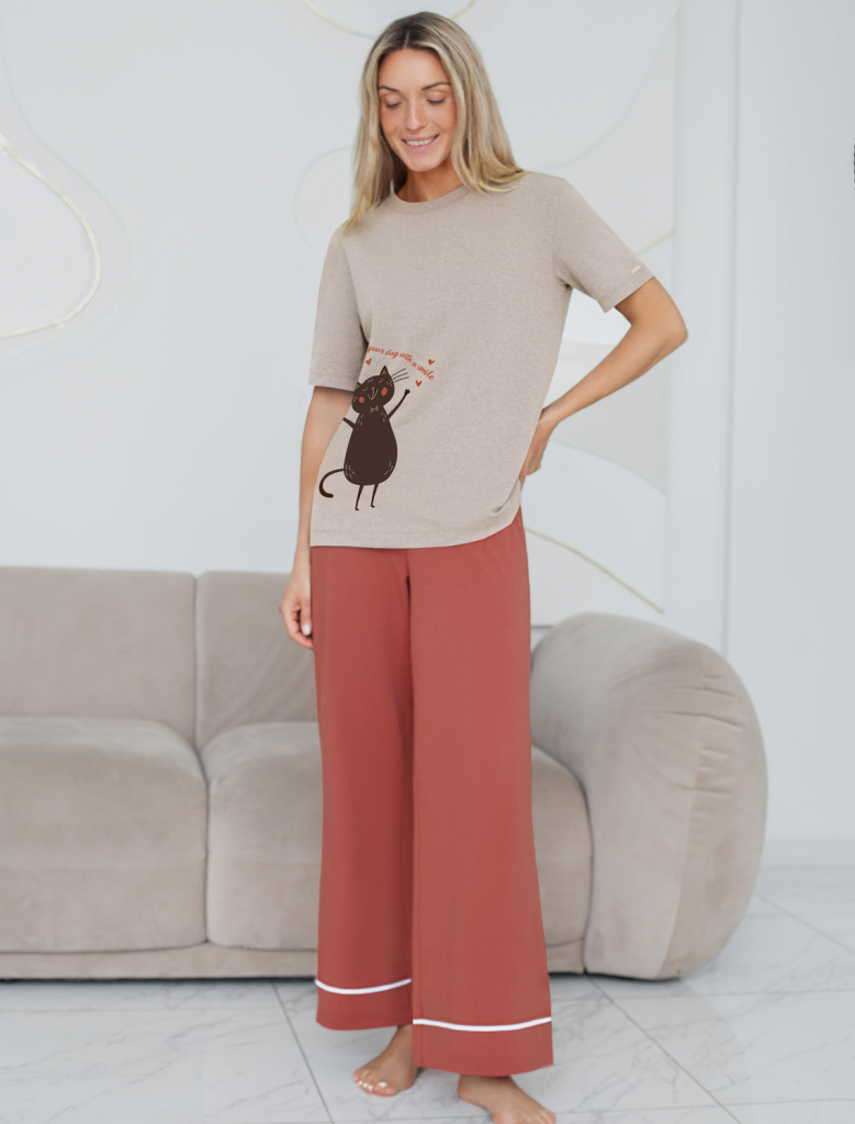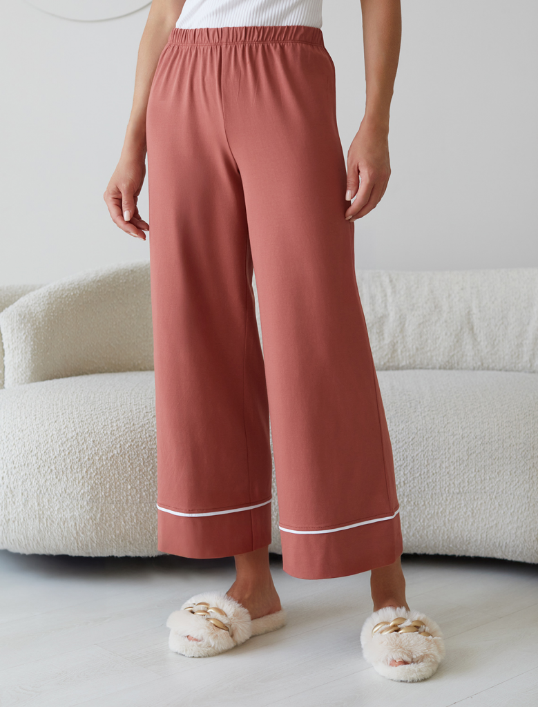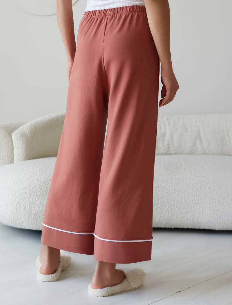 Укороченные брюки актуального кирпичного цвета из мягкого эластичного хлопка подарят вам комфорт в любое время дня. Прямой крой обеспечивает свободу движений и удобство при носке. Материал приятен на ощупь, хорошо пропускает воздух и позволяет коже дышать, делая эти брюки идеальным выбором для повседневной носки. Широкие брюки прекрасно подойдут на женщин с фигурой плюс сайз, на высокий рост и на девушек низкого роста, создут гармоничный образ без стеснения движений. Представлены большие размеры. Контрастный кант по низу добавляет стильный акцент и возможность сочетать с белыми футболками нашего бренда. Эти брючки идеально подойдут тем, кто ищет стильное решение с учетом комфорта и удобства, в них вы будете женственны и утонченны даже в домашней обстановке.